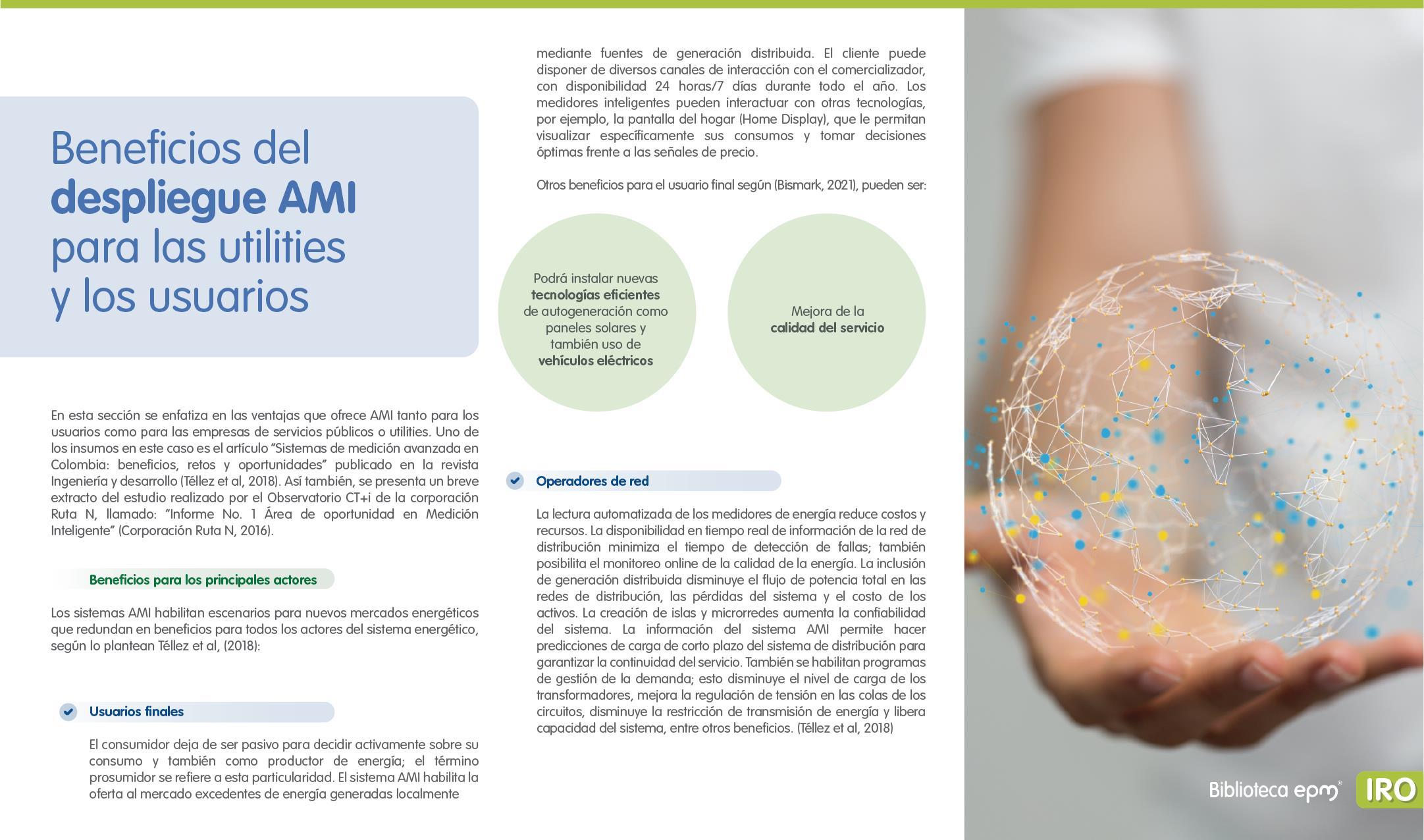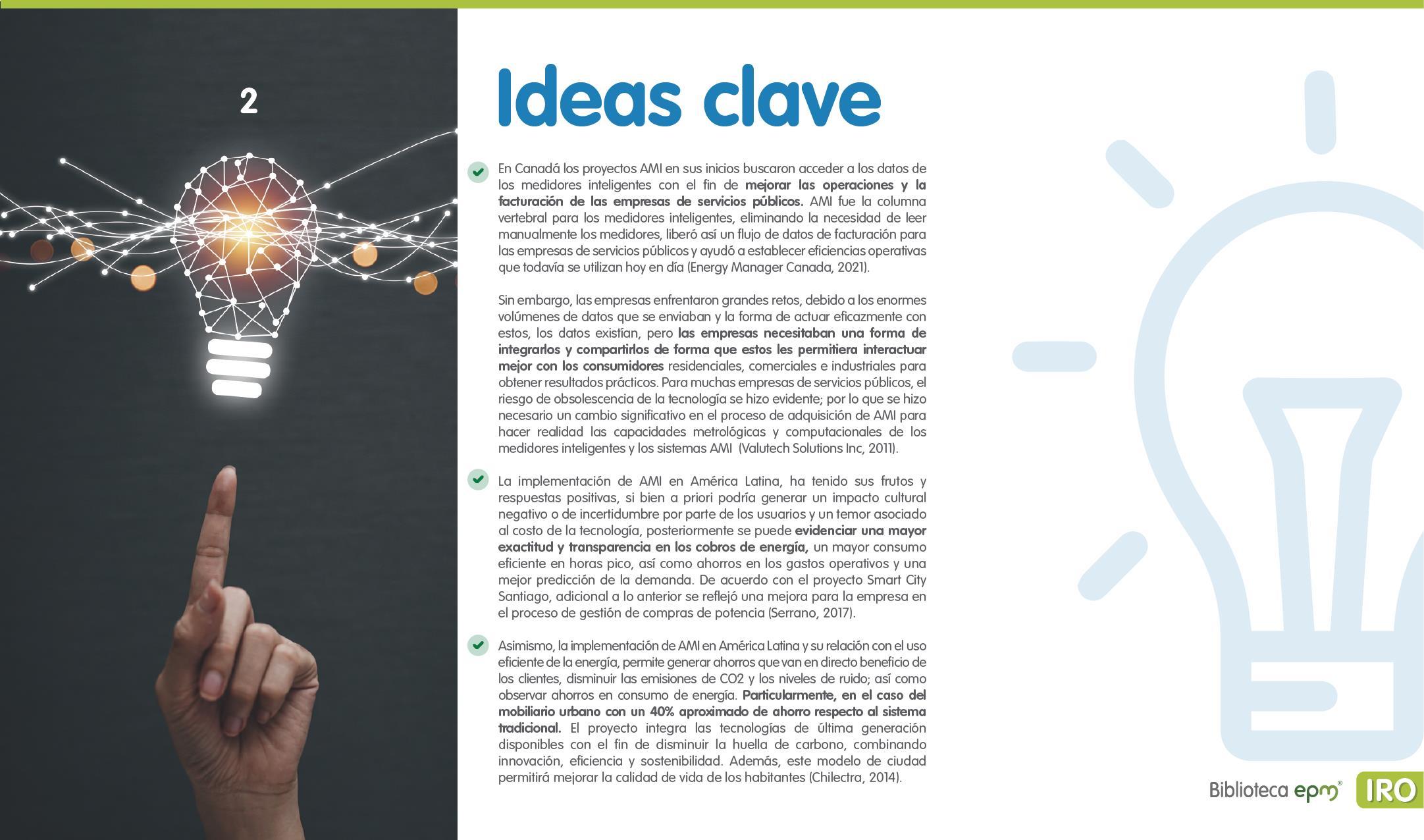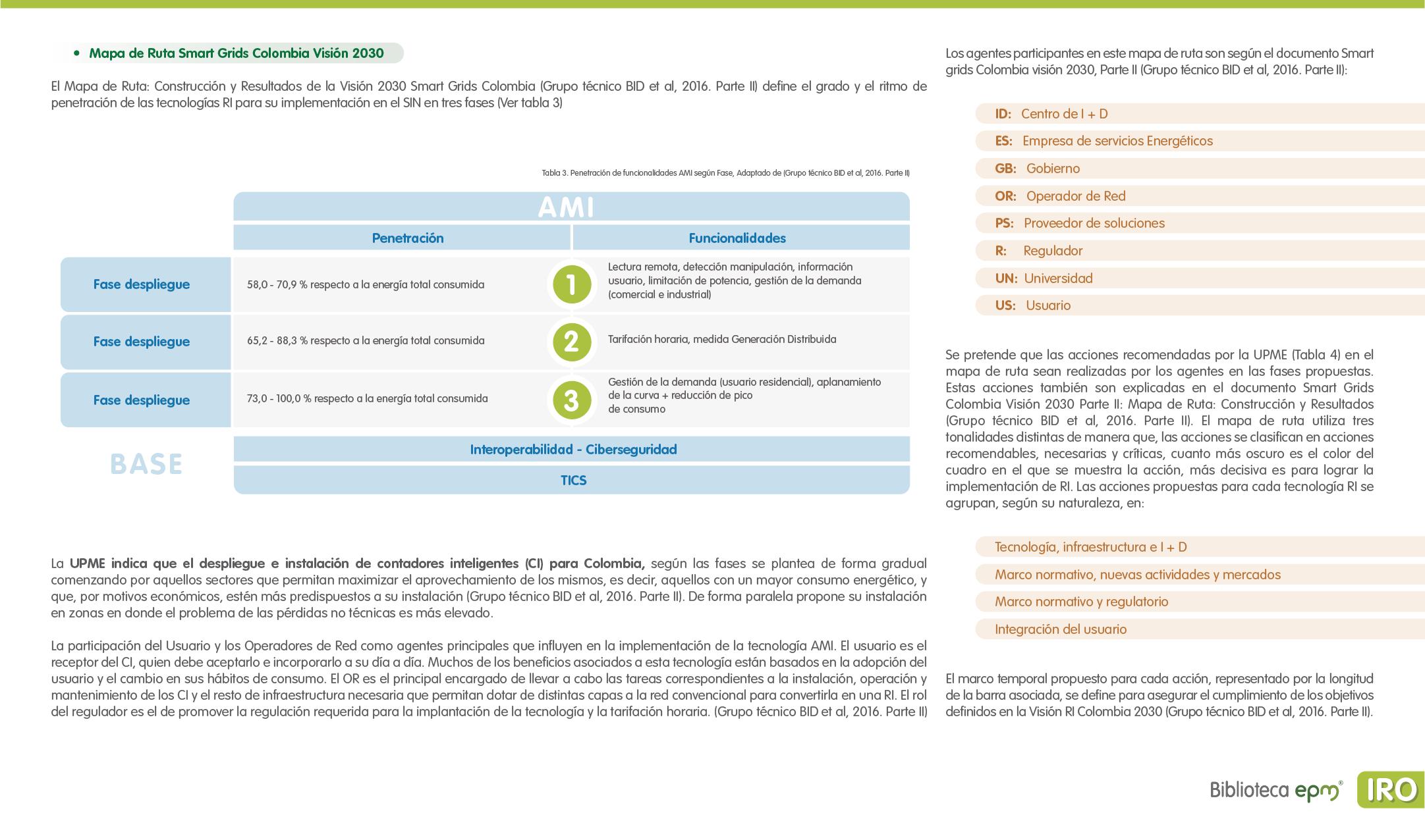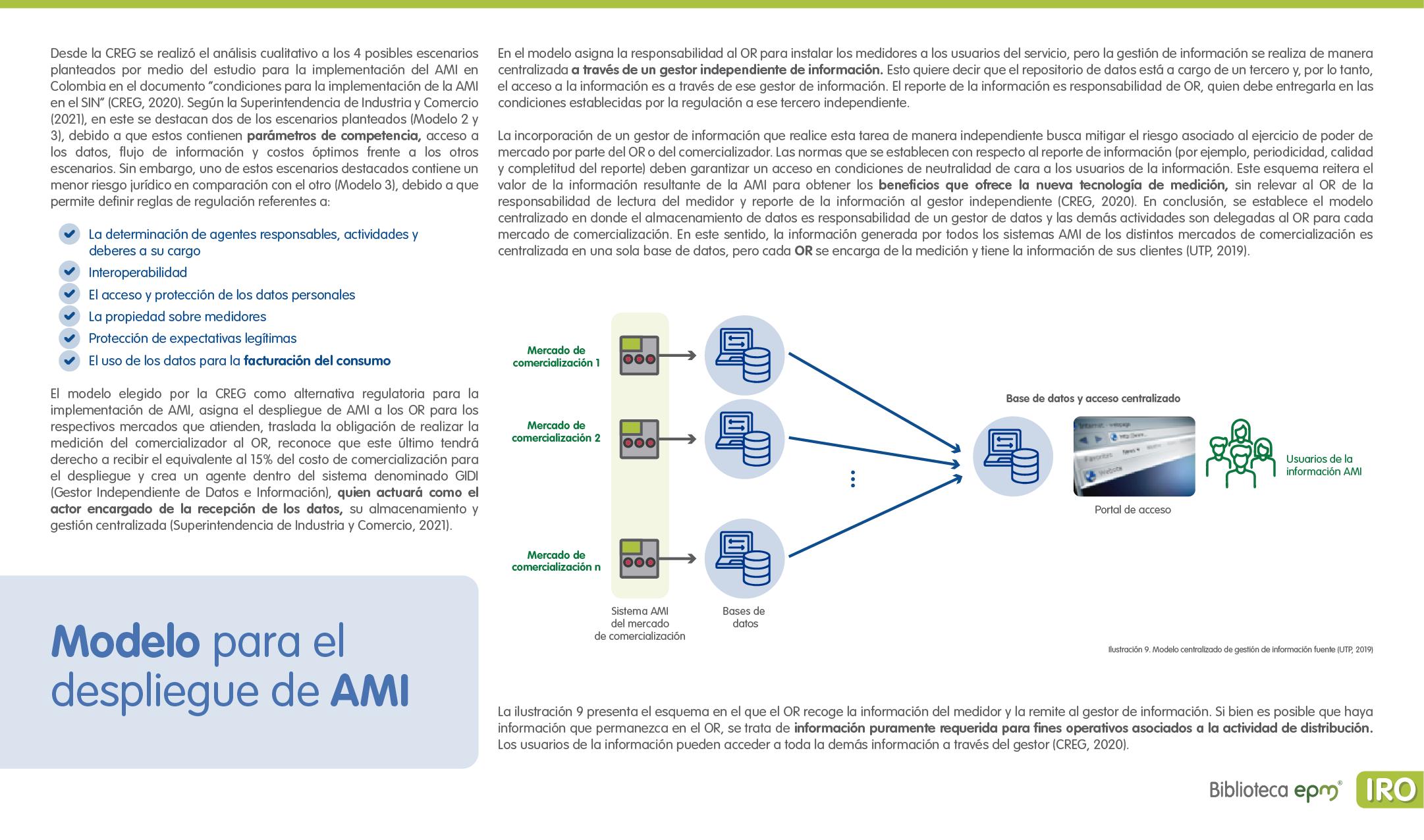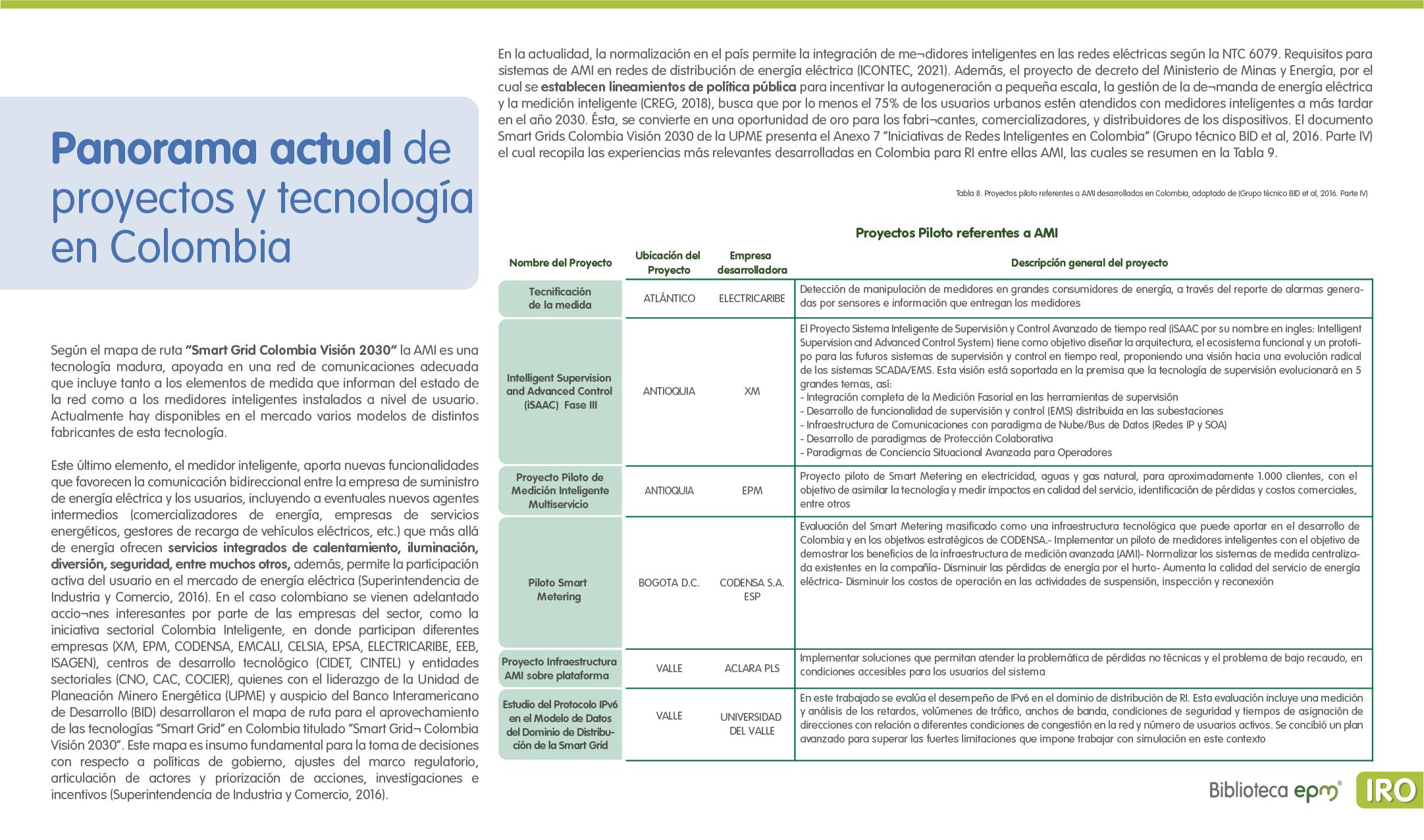 El informe está compuesto por 6 capítulos: Ciudades inteligentes y el rol de la Infraestructura de Medición Avanzada (AMI); AMI en Colombia, normatividad y proyectos; Cómo se implementa AMI en el mundo. Casos de estudio; Mercado de AMI; Ciberseguridad y otros aspectos técnicos de AMI; Implicaciones, riesgos y oportunidades para las ciudades inteligentes enfocados en AMI. Dentro de cada capítulo se tienen inicialmente algunas ideas clave, extraídas de los papers, artículos y reportes citados, para luego presentar en detalle sus resultados, conclusiones de las investigaciones y puntos de vista de sus autores.