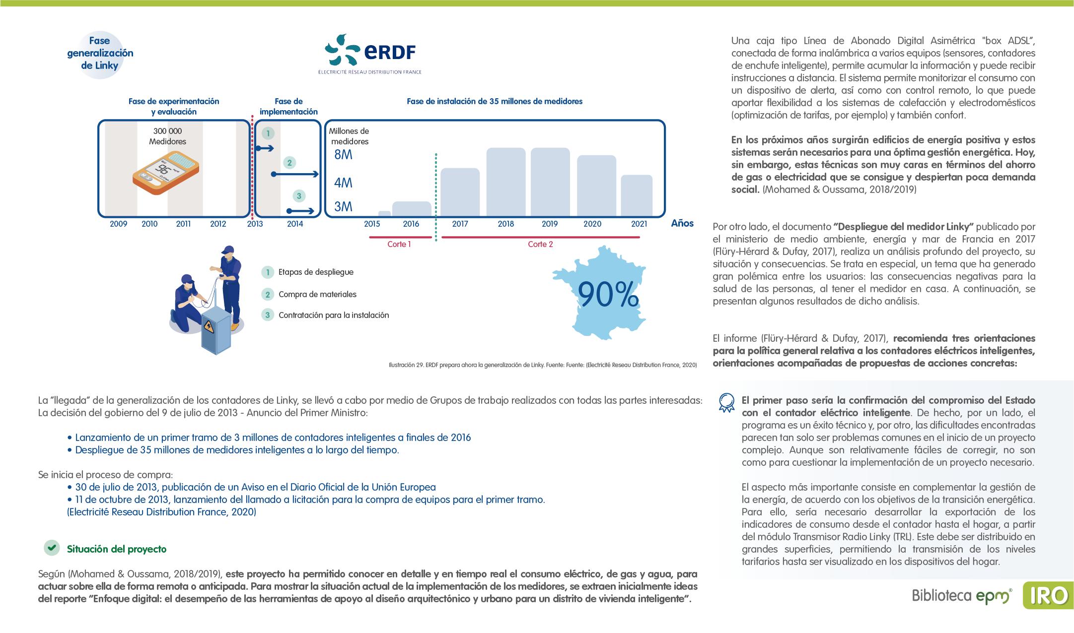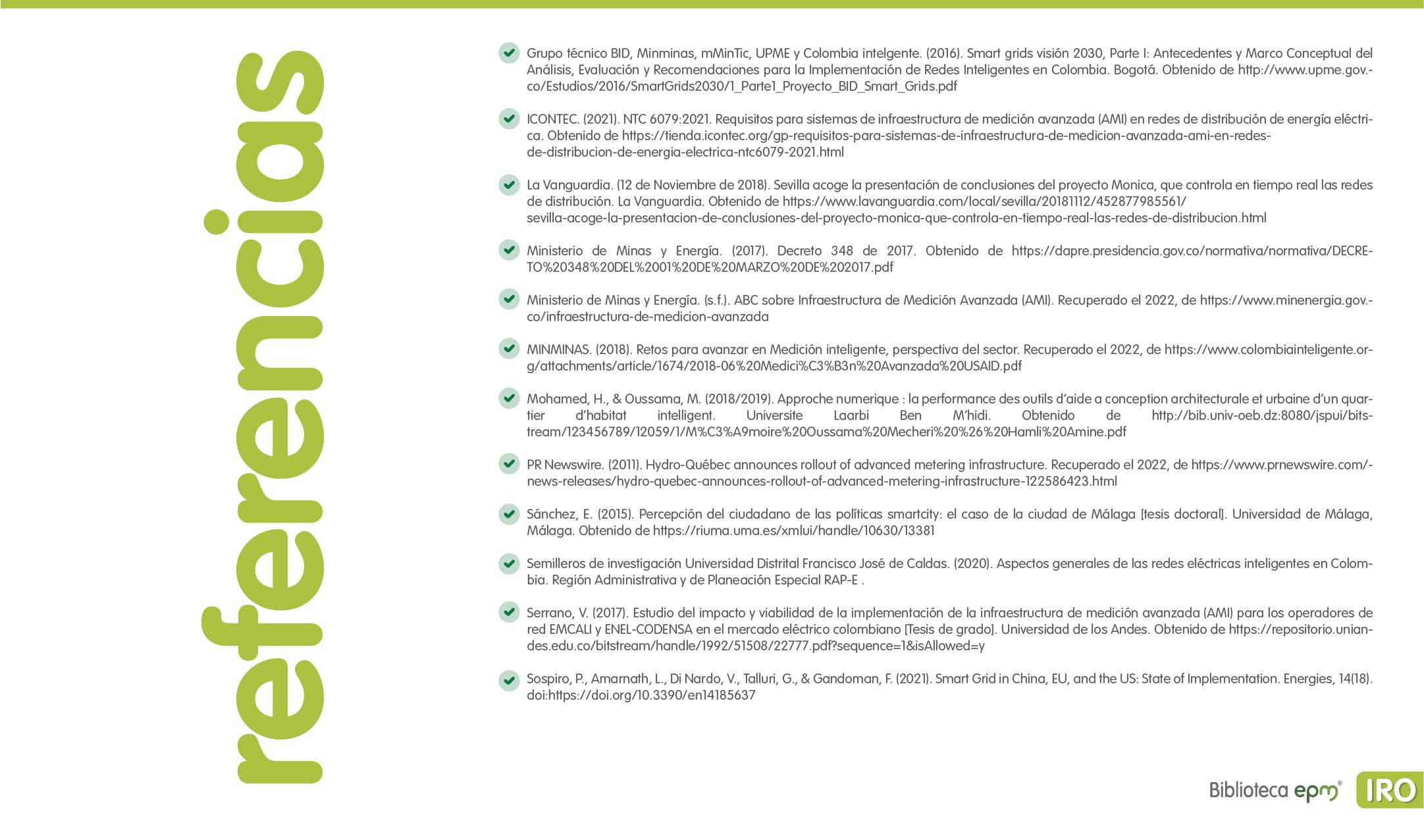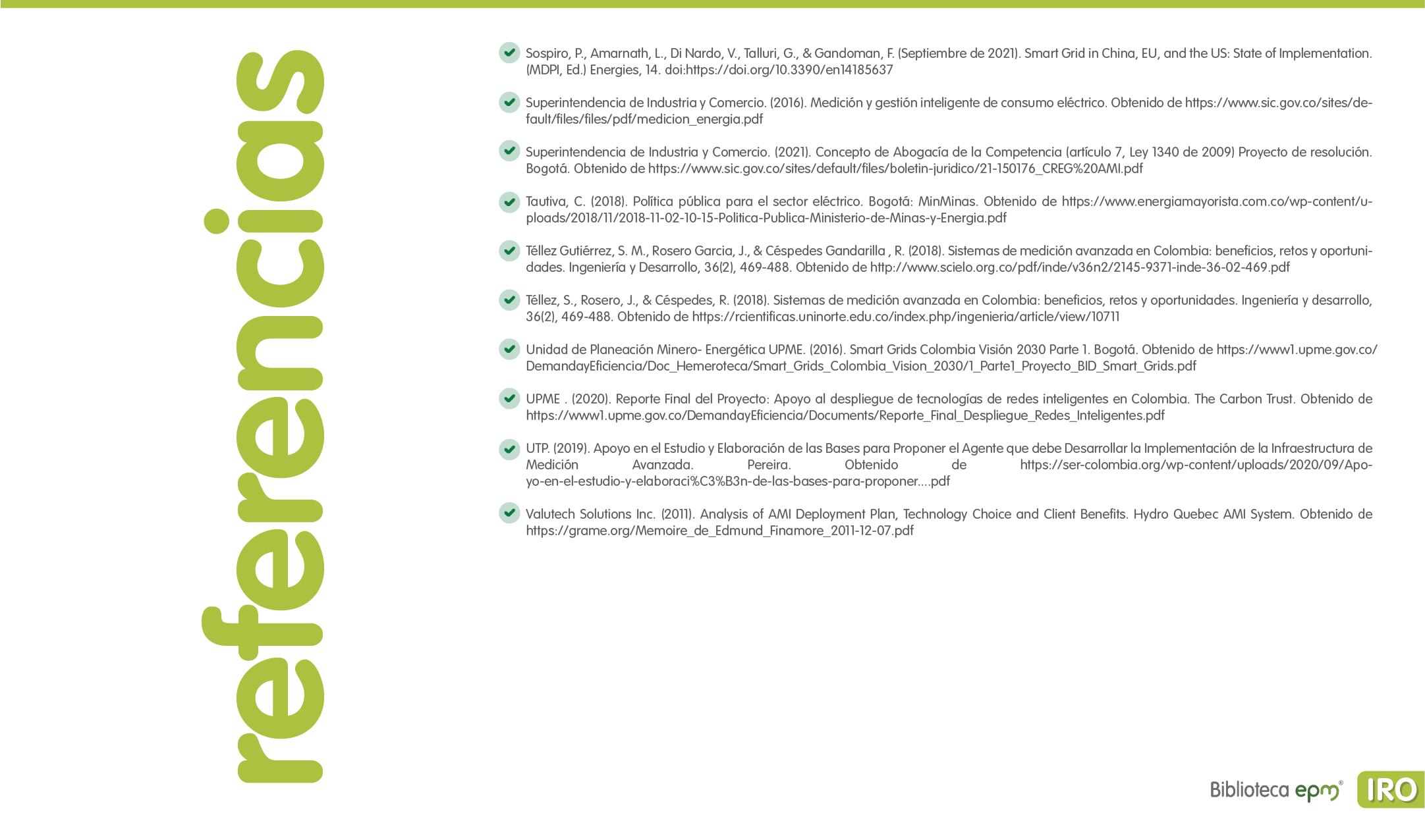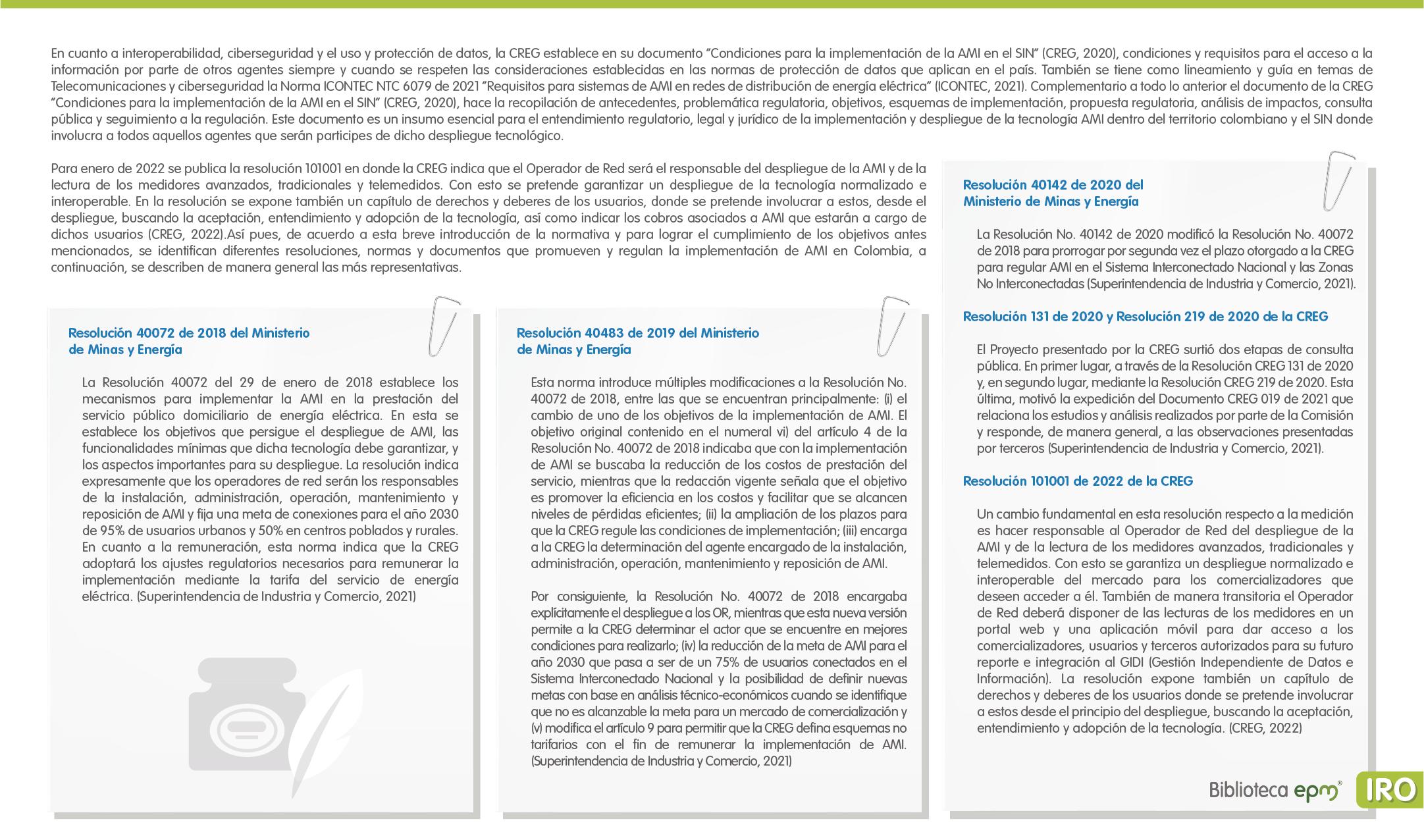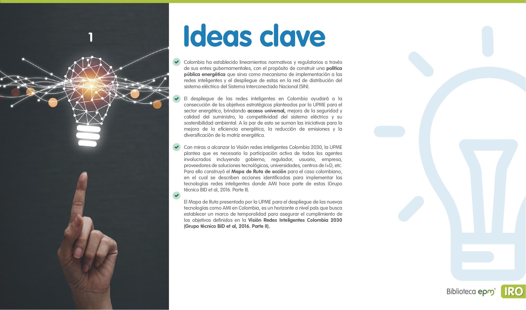El informe está compuesto por 6 capítulos: Ciudades inteligentes y el rol de la Infraestructura de Medición Avanzada (AMI); AMI en Colombia, normatividad y proyectos; Cómo se implementa AMI en el mundo. Casos de estudio; Mercado de AMI; Ciberseguridad y otros aspectos técnicos de AMI; Implicaciones, riesgos y oportunidades para las ciudades inteligentes enfocados en AMI. Dentro de cada capítulo se tienen inicialmente algunas ideas clave, extraídas de los papers, artículos y reportes citados, para luego presentar en detalle sus resultados, conclusiones de las investigaciones y puntos de vista de sus autores.