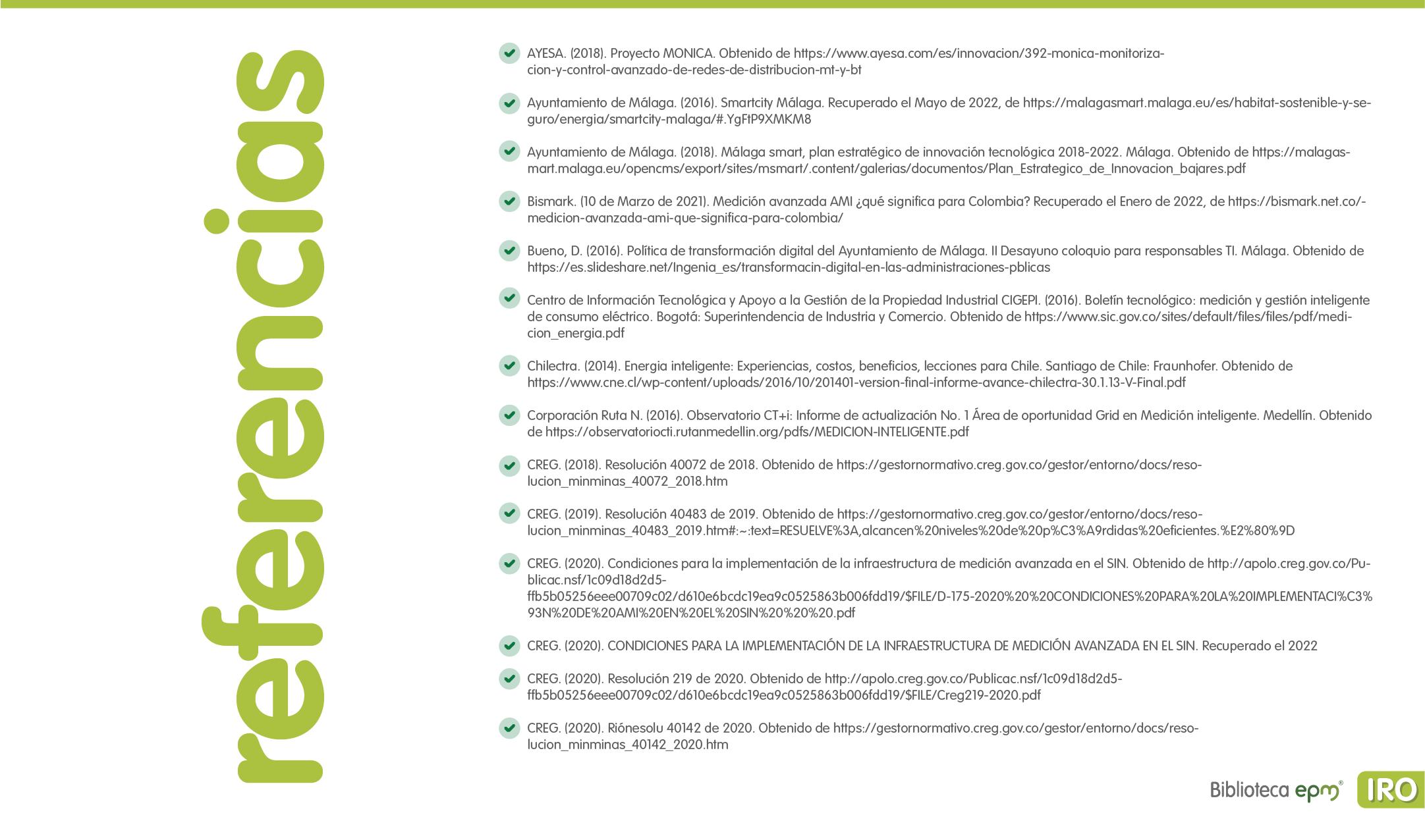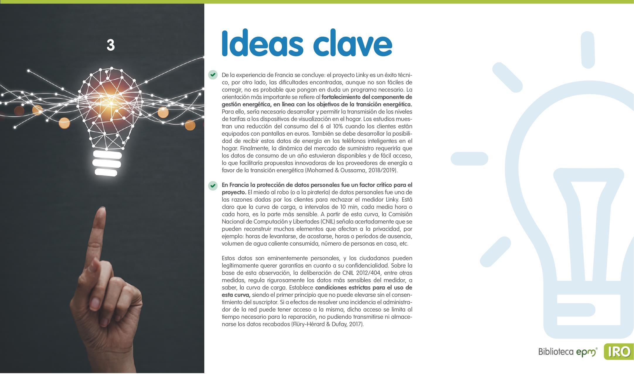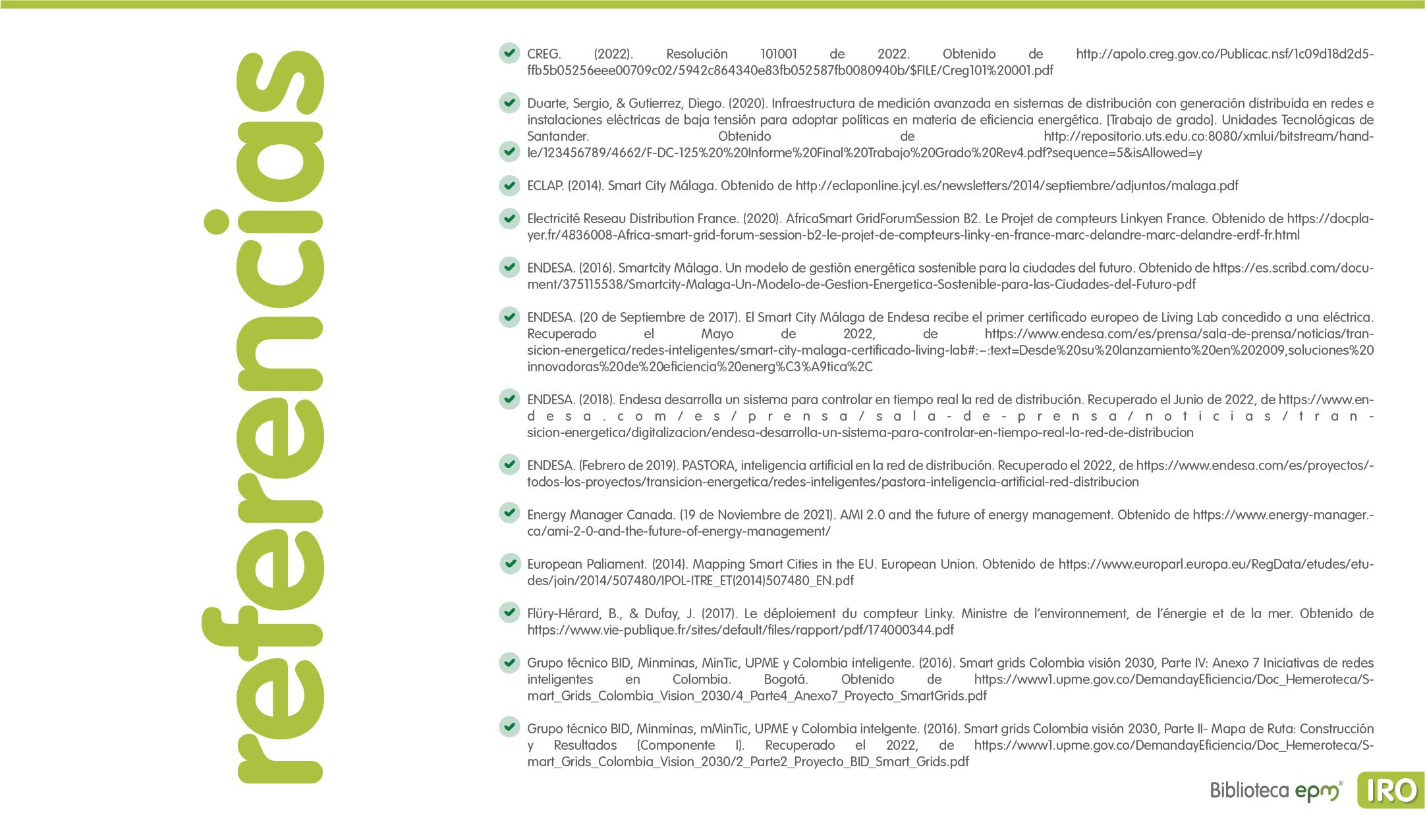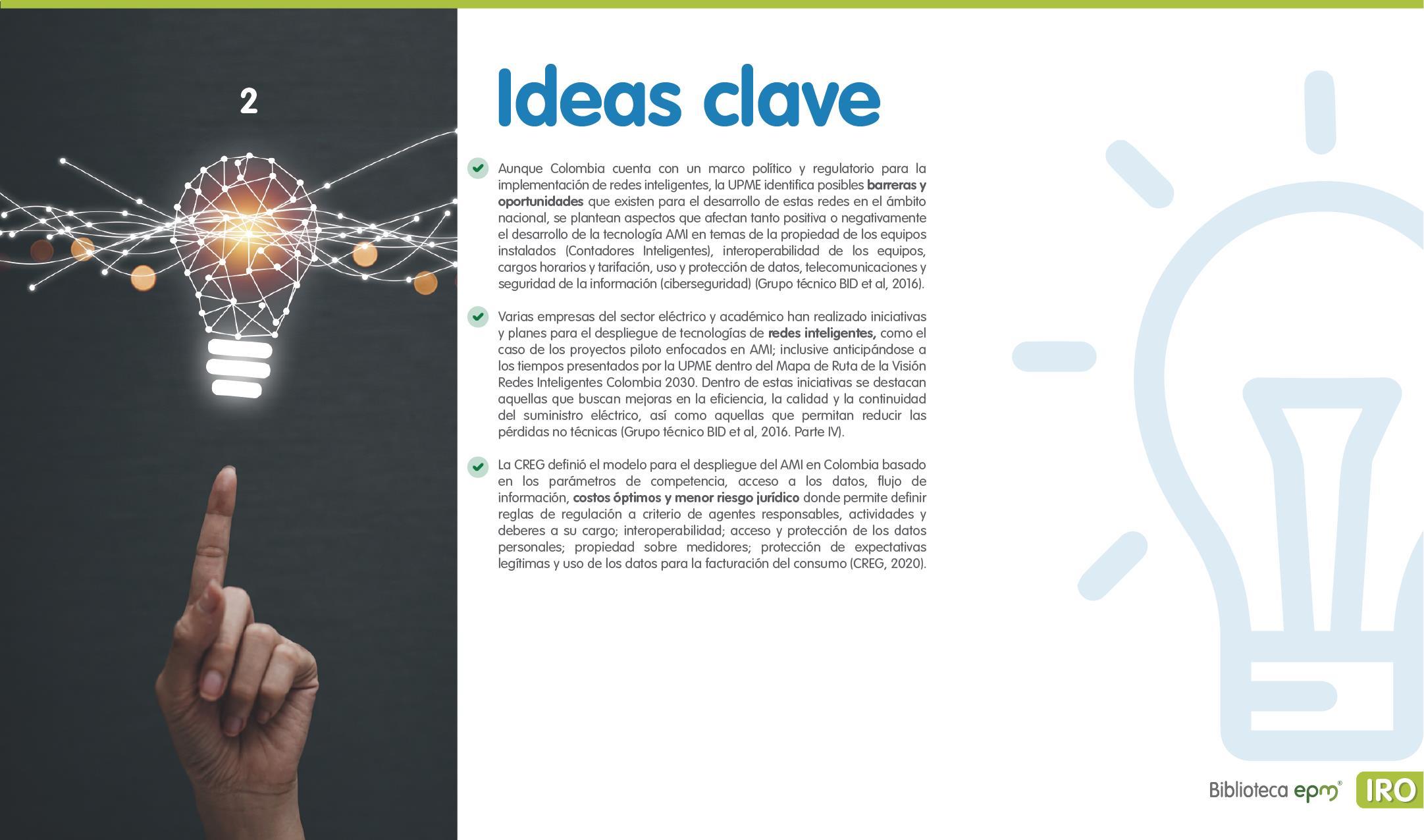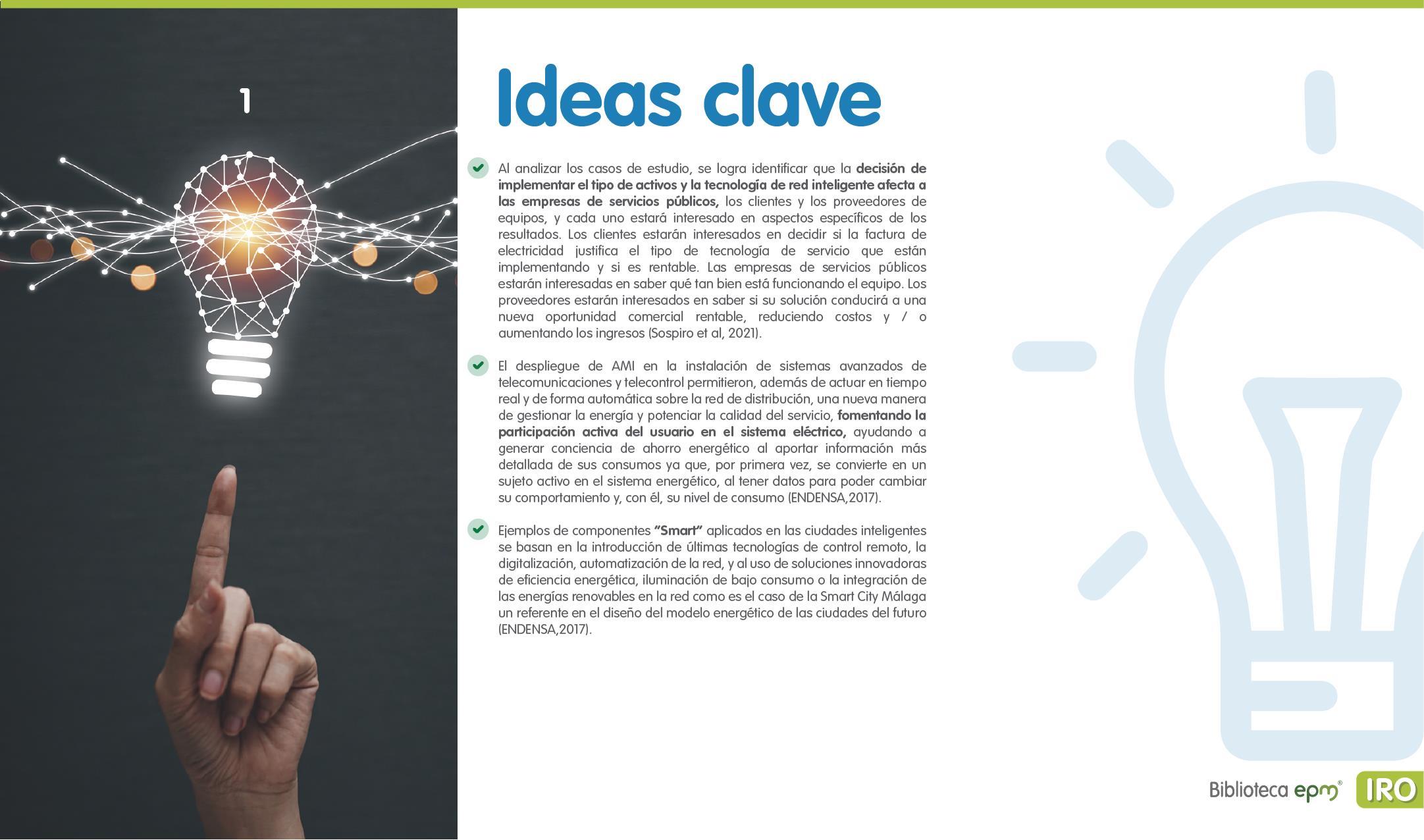 El informe está compuesto por 6 capítulos: Ciudades inteligentes y el rol de la Infraestructura de Medición Avanzada (AMI); AMI en Colombia, normatividad y proyectos; Cómo se implementa AMI en el mundo. Casos de estudio; Mercado de AMI; Ciberseguridad y otros aspectos técnicos de AMI; Implicaciones, riesgos y oportunidades para las ciudades inteligentes enfocados en AMI. Dentro de cada capítulo se tienen inicialmente algunas ideas clave, extraídas de los papers, artículos y reportes citados, para luego presentar en detalle sus resultados, conclusiones de las investigaciones y puntos de vista de sus autores.
