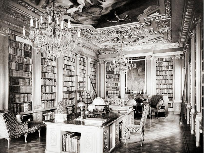 Ovan: Stora biblioteket mot söder 1928. Bokhyllan till vänster om den stora porträttmålningen på kortväggen var även en lönndörr till Jean Jahnssons ”privatrum”. Nästa Uppslag: Stora biblioteket mot norr.