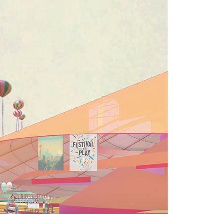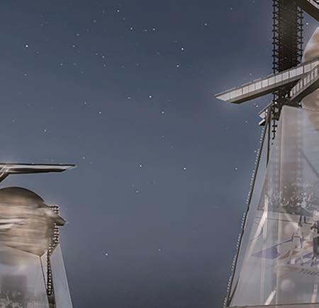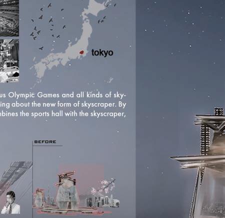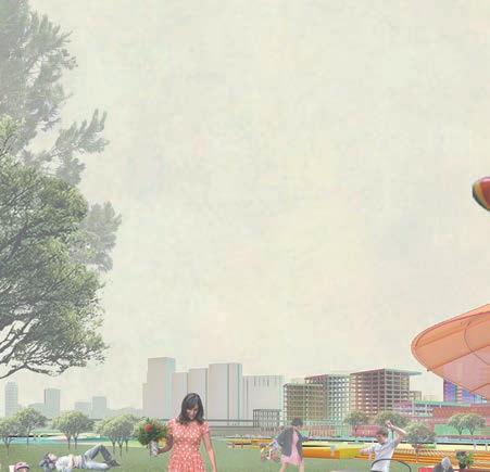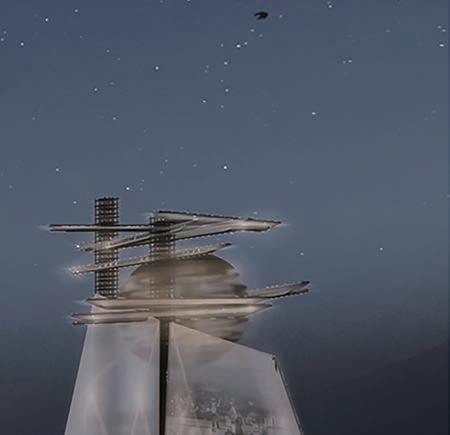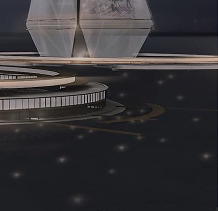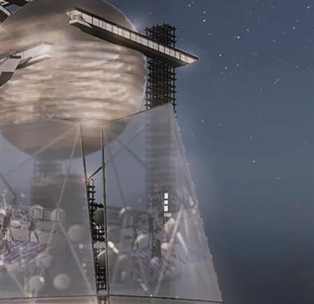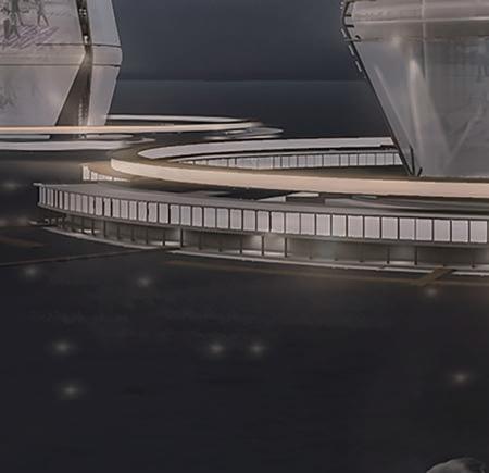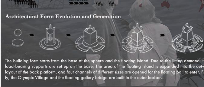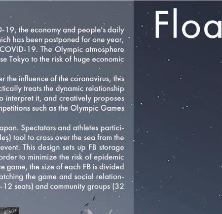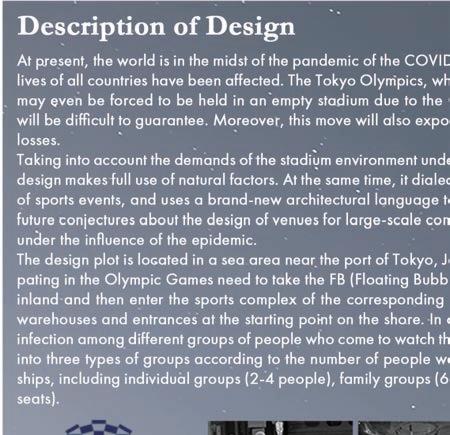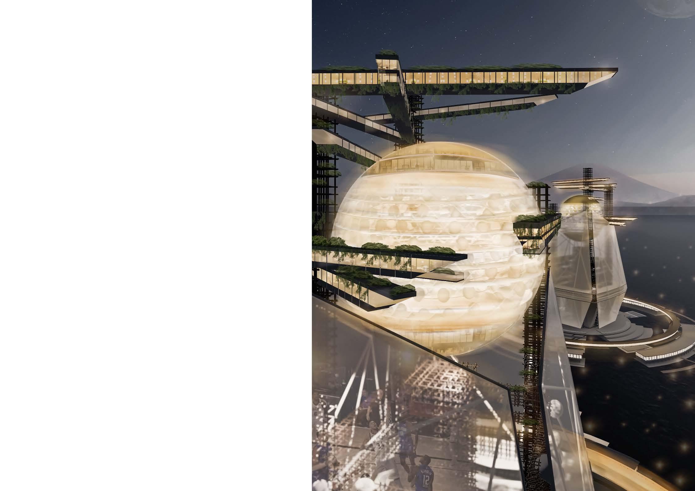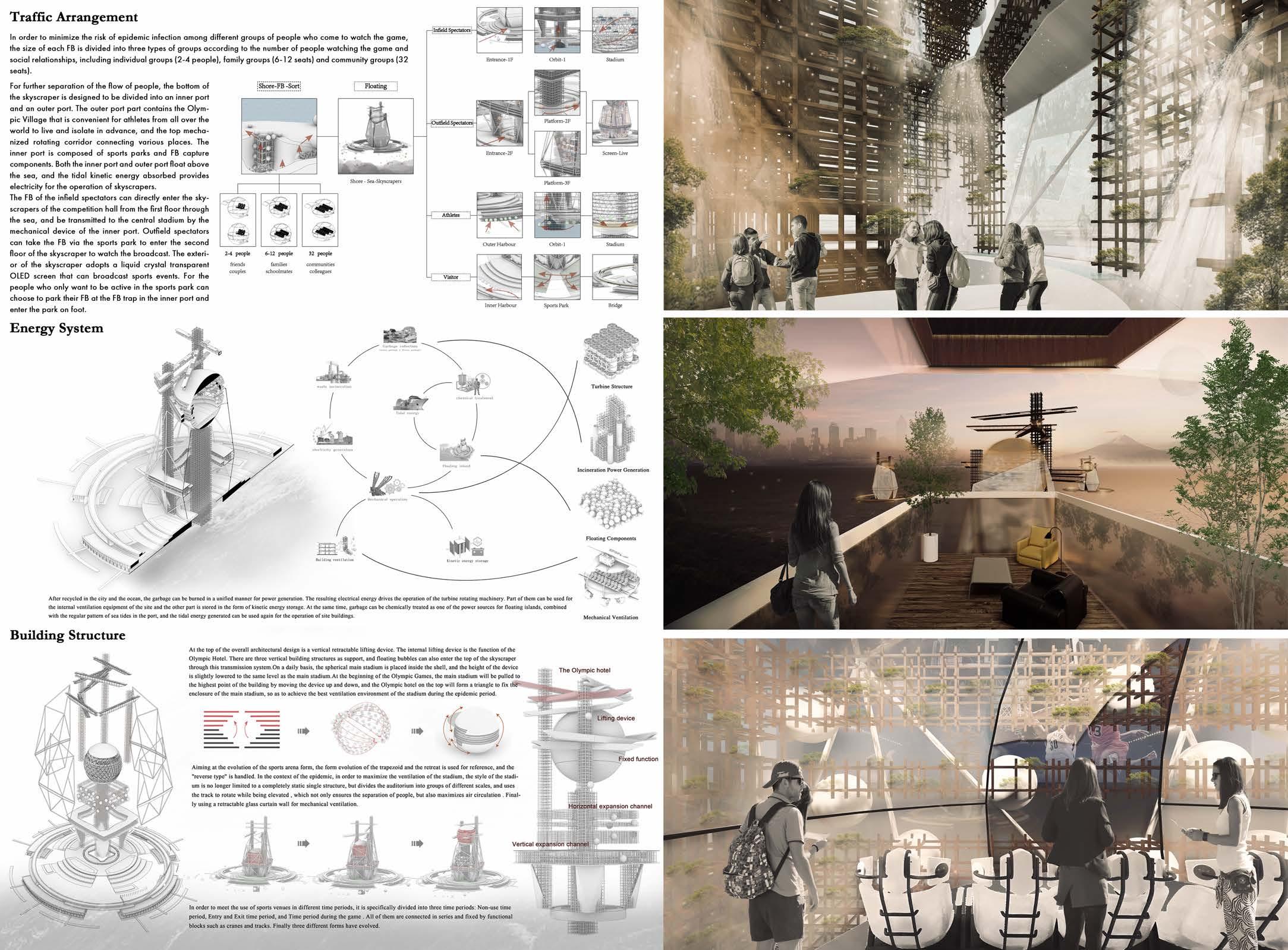 The venue will be located on the sea of Tokyo Bay to achieve the same effect as the stadium, while safely isolating the COVID-19 virus. We designed the spherical spectator compartment of floating bubbles. The tower of the main stadium is divided into several parts. The lowest floor is a circular public service area, which contains public activity Spaces such as catering and selling of Olympic peripheral commodities. The middle level of the tower is built with a network of rails and steel frames for transportation of FB, and the top level is designed with high-end hotel accommodation. The different required functions are concentrated in one tower.