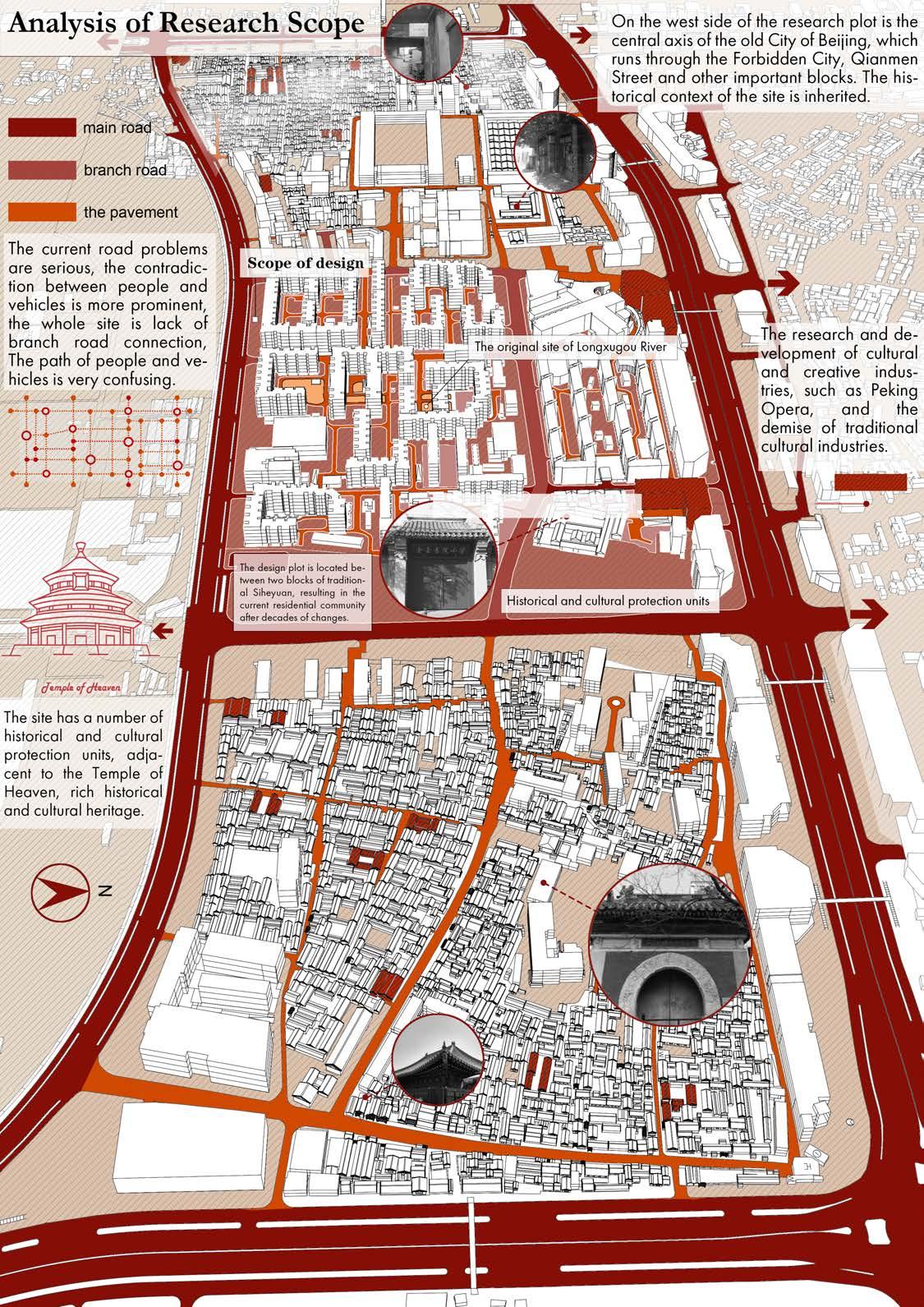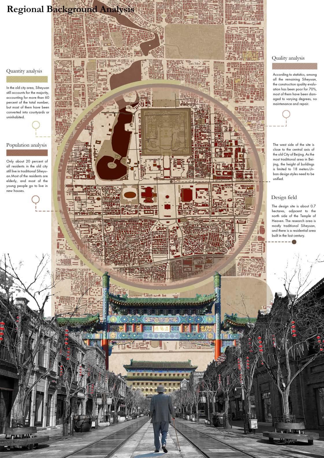 The site is adjacent to the north side of the Temple of Heaven. Today, the Siheyuan is dilapidated and unrepaired, and most of the indigenous people have moved out. In the absence of management, a large number of man-made buildings have destroyed the spatial pattern and street environment of Siheyuan.Siheyuan has become endangered and has to be changed.