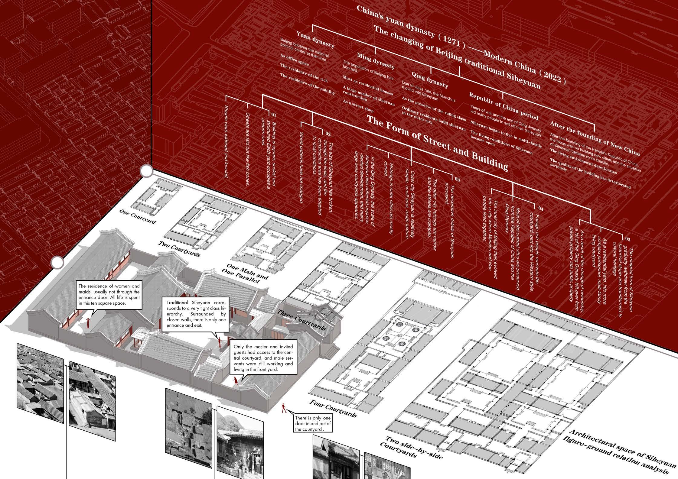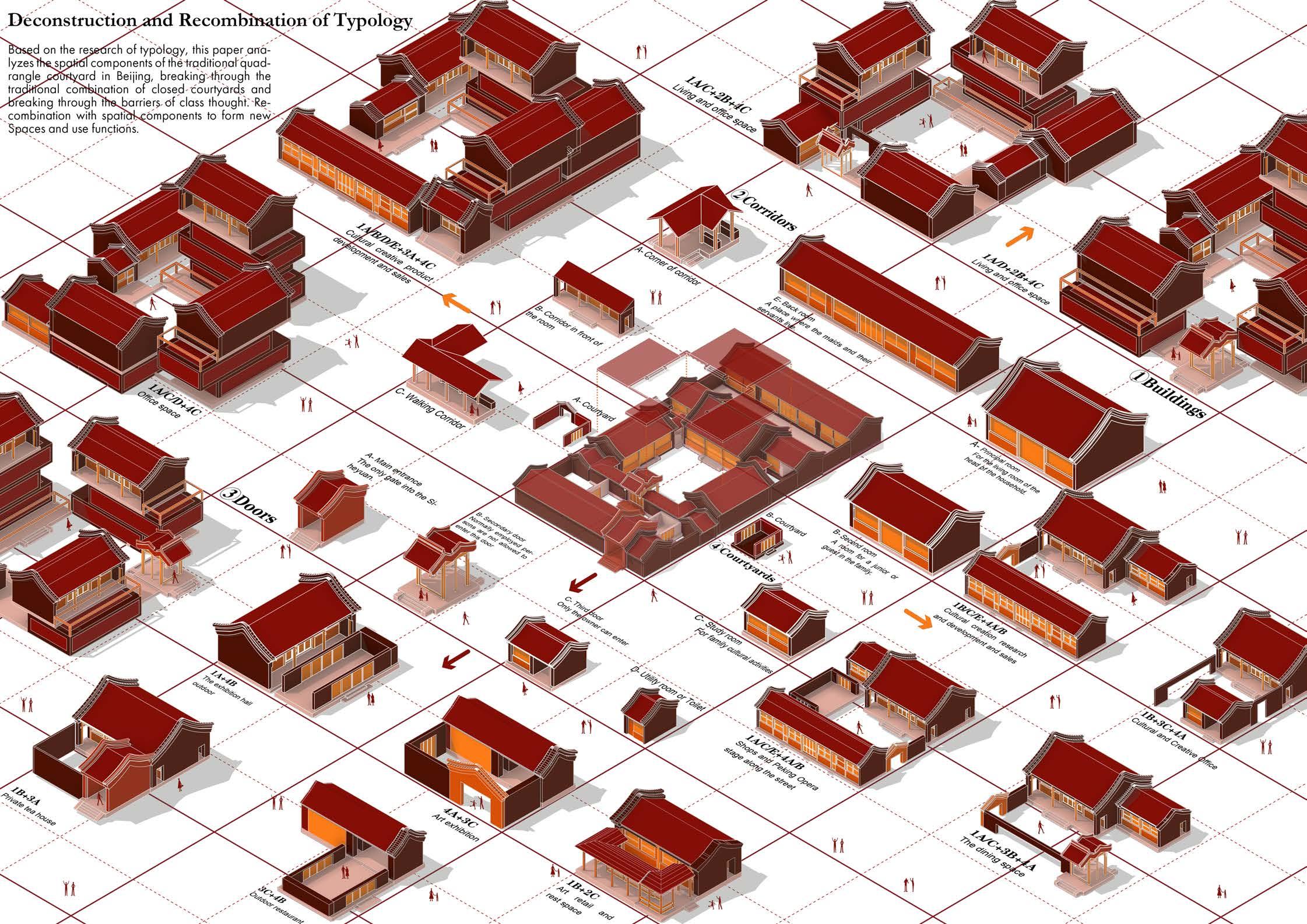 This project uses typology design techniques to select the components of Siheyuan, and reorganizes the architecture and space according to the different functions required by the design site, so as to revitalize the vitality of the site.