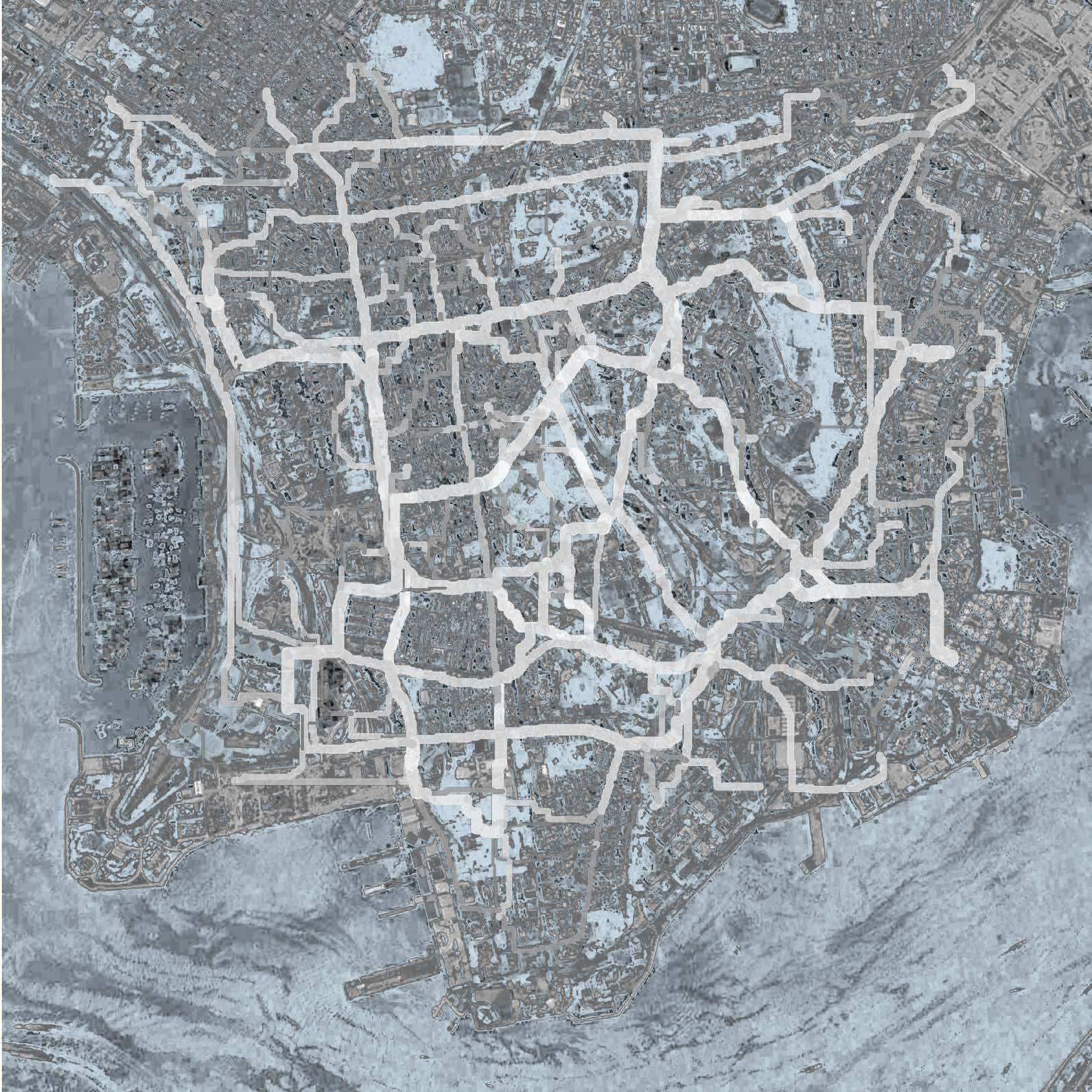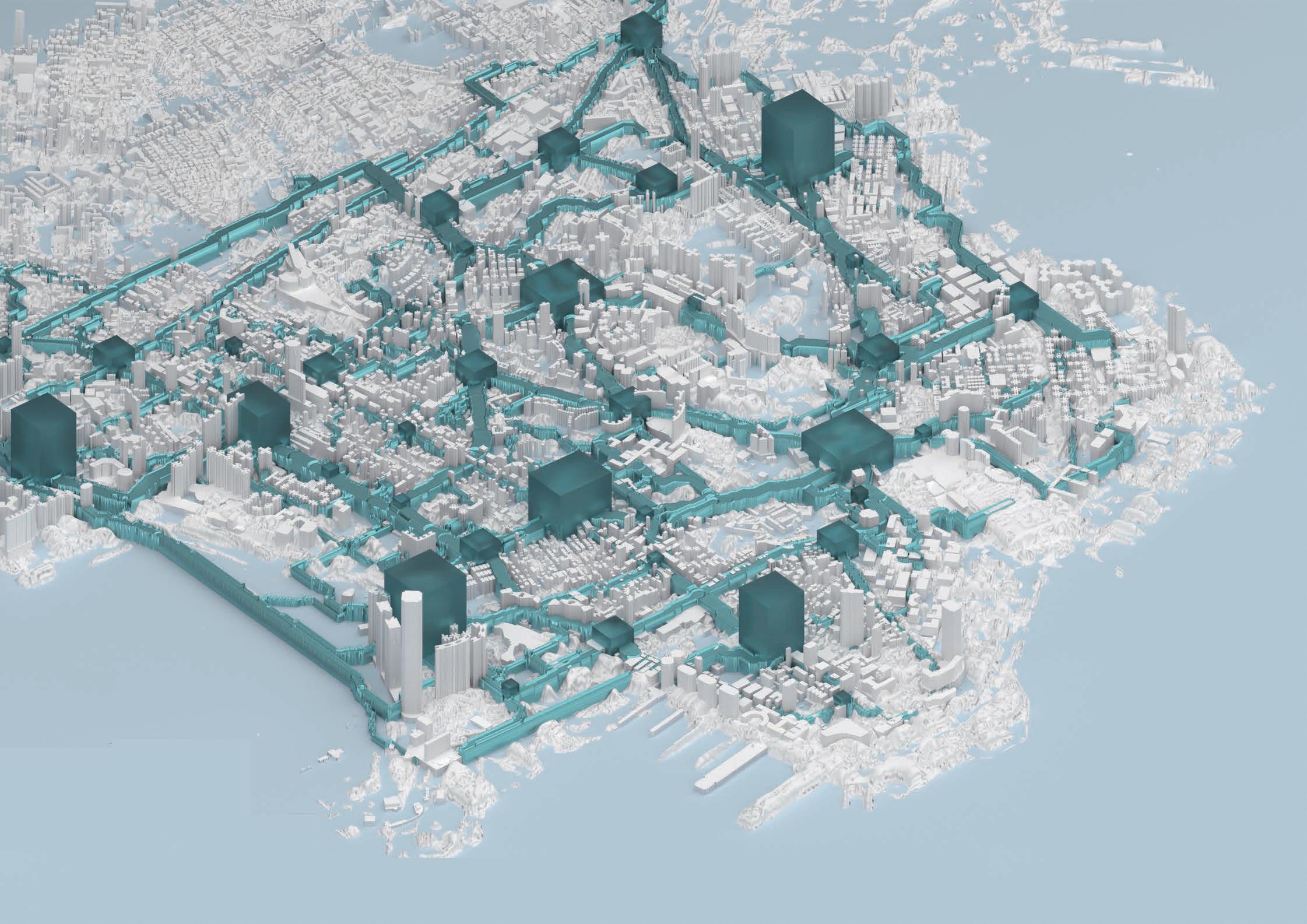 Therefore, this project takes Kowloon Peninsula of Hong Kong as the site to design a twoway system of logistics transportation and garbage recycling and uses parametric design to simulate the optimal path of the passage. And in the core node position, the design of