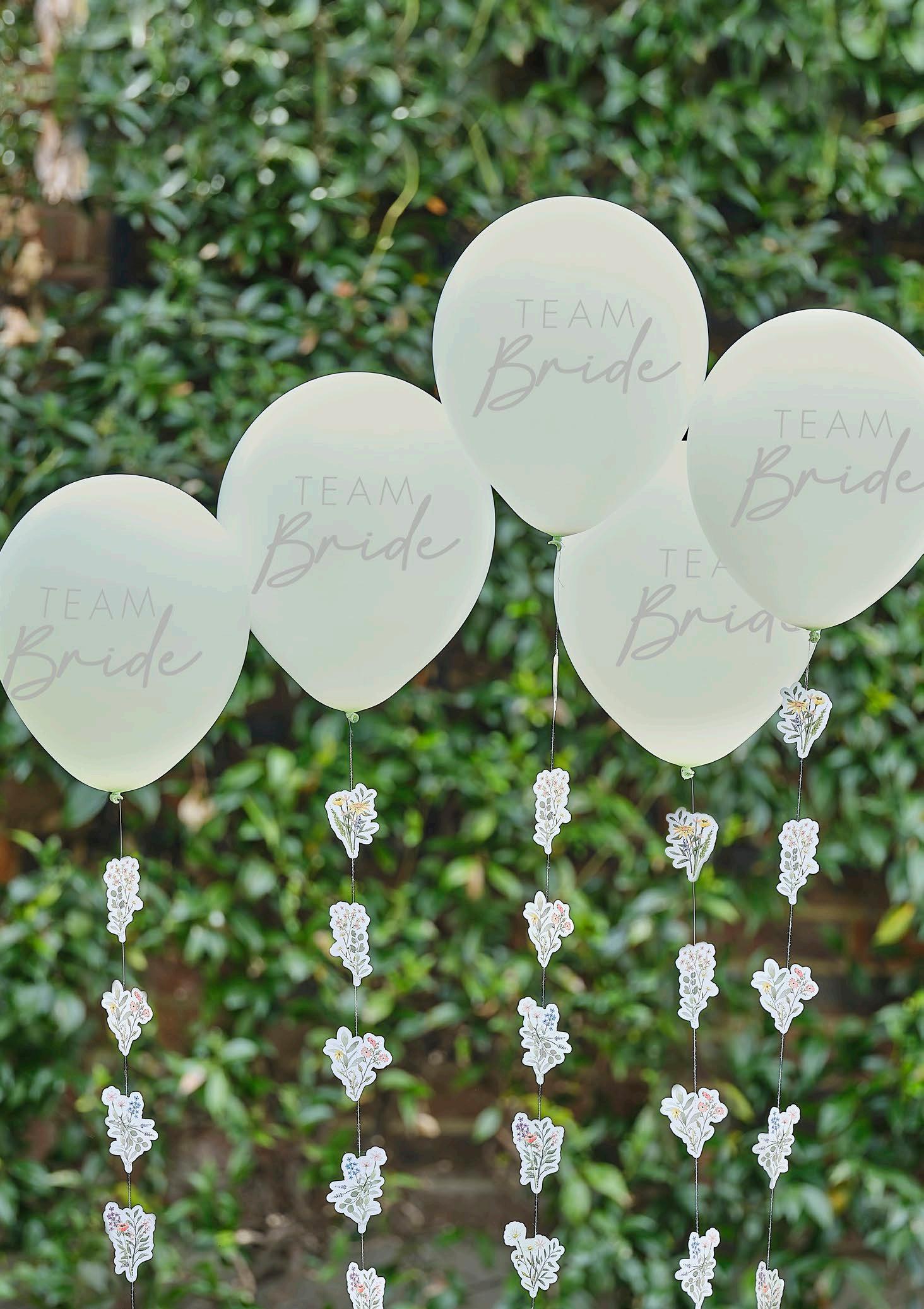 Float these ‘Team Bride’ balloons with floral tails around the venue to complete the look