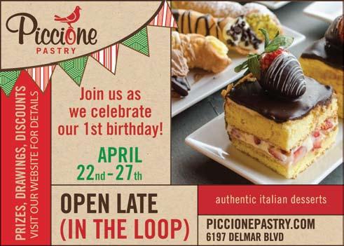 Nutella banana-nut muffins at Annie Moons Bakery, Chocolate Inebriation cake with cinnamon ice cream at Baileys’ Chocolate Bar, lump crab “beignets” with fontina cheese at Molly’s in Soulard, and the Moroccan potpie at The Fountain on Locust. With delightful dishes like these at more than 150 area restaurants participating in this year’s Dining Out for Life, on April 24, you might want to eat out for all three meals. A percentage of the restaurants’ till that day benefits Saint Louis Effort for AIDS. A full list of participating restaurants is available online.