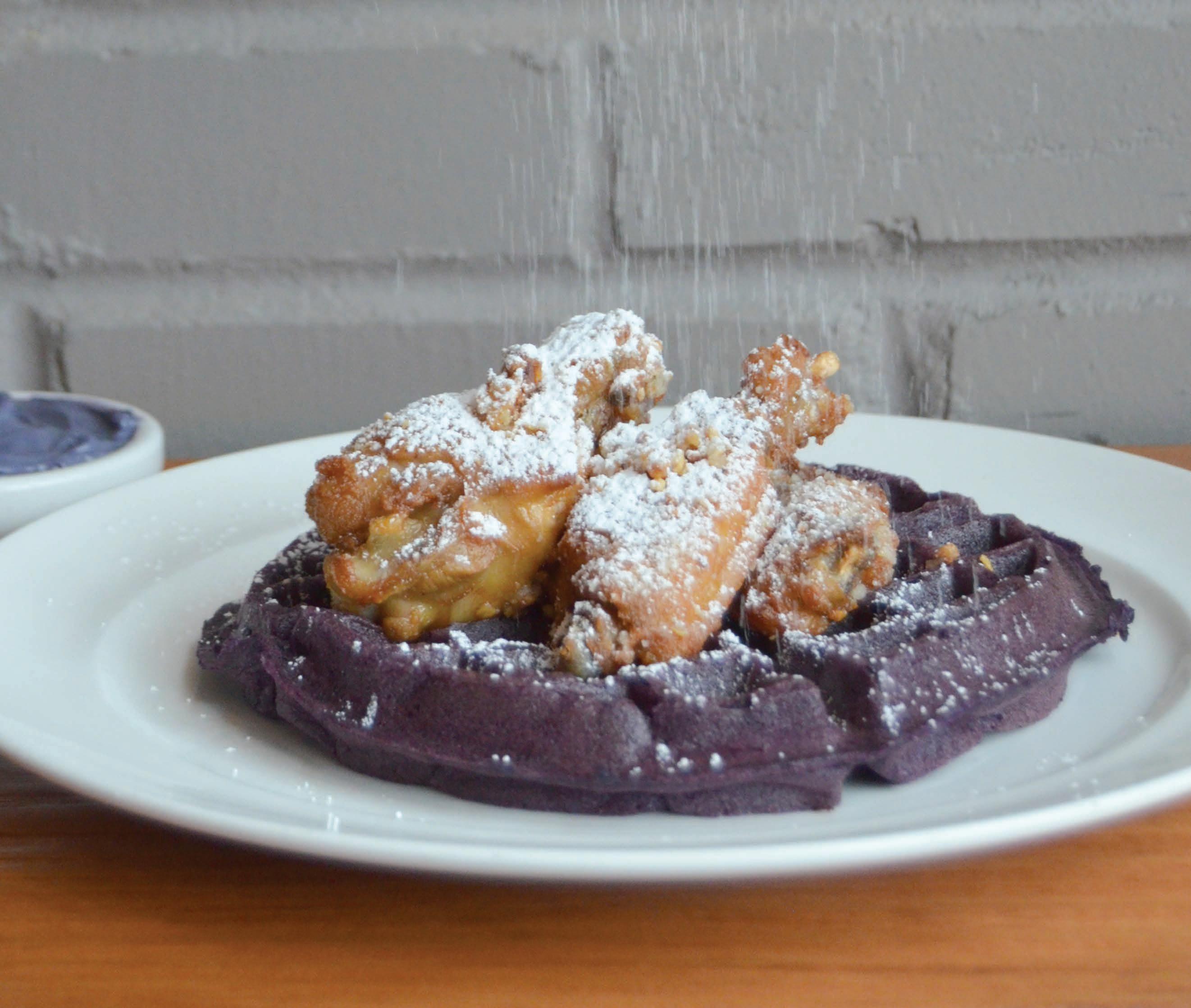 previous page: manileño; this page, from top: mango calamansi cheesecake and chicken and ube waffles at manileño