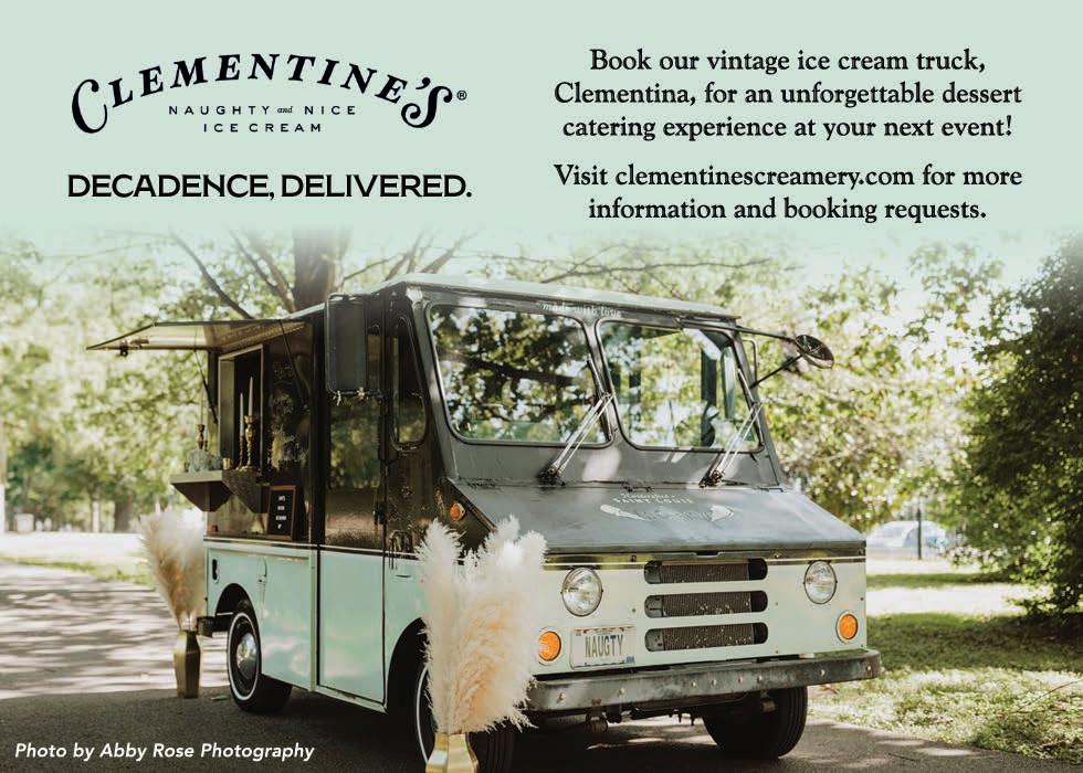 Clementine’s Ice Cream serves unique Naughty (alcohol-infused), Nice (grass-grazed dairy) and Vegan flavor options. As a microcreamery, all of Clementine’s ice cream must: be churned in small batches; be made by hand; have an all-natural dairy base; be made with less than 30% overrun; be made with more than 16% butterfat. It’s the process that makes our ice cream so decadent! Our most popular flavor is Gooey Butter Cake, with chunks of scratch-made gooey butter cake layered in a rich and tangy cream cheese ice cream and inspired by the classic St. Louis breakfast pastry. Clementine’s has an extraordinary events team to cater any and all special occasions. Choose from a vintage ice cream truck, Spokes & Spoons Bicycle or Ice Cream Station as options to make magical memories at your event.