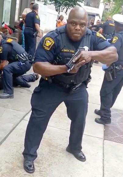 While officer Orlando Smith stands between Lee and the unfolding arrest, Smith’s gun drawn, Lee appears to take side-to-side steps, keeping his camera in view of Taylor’s arrest.