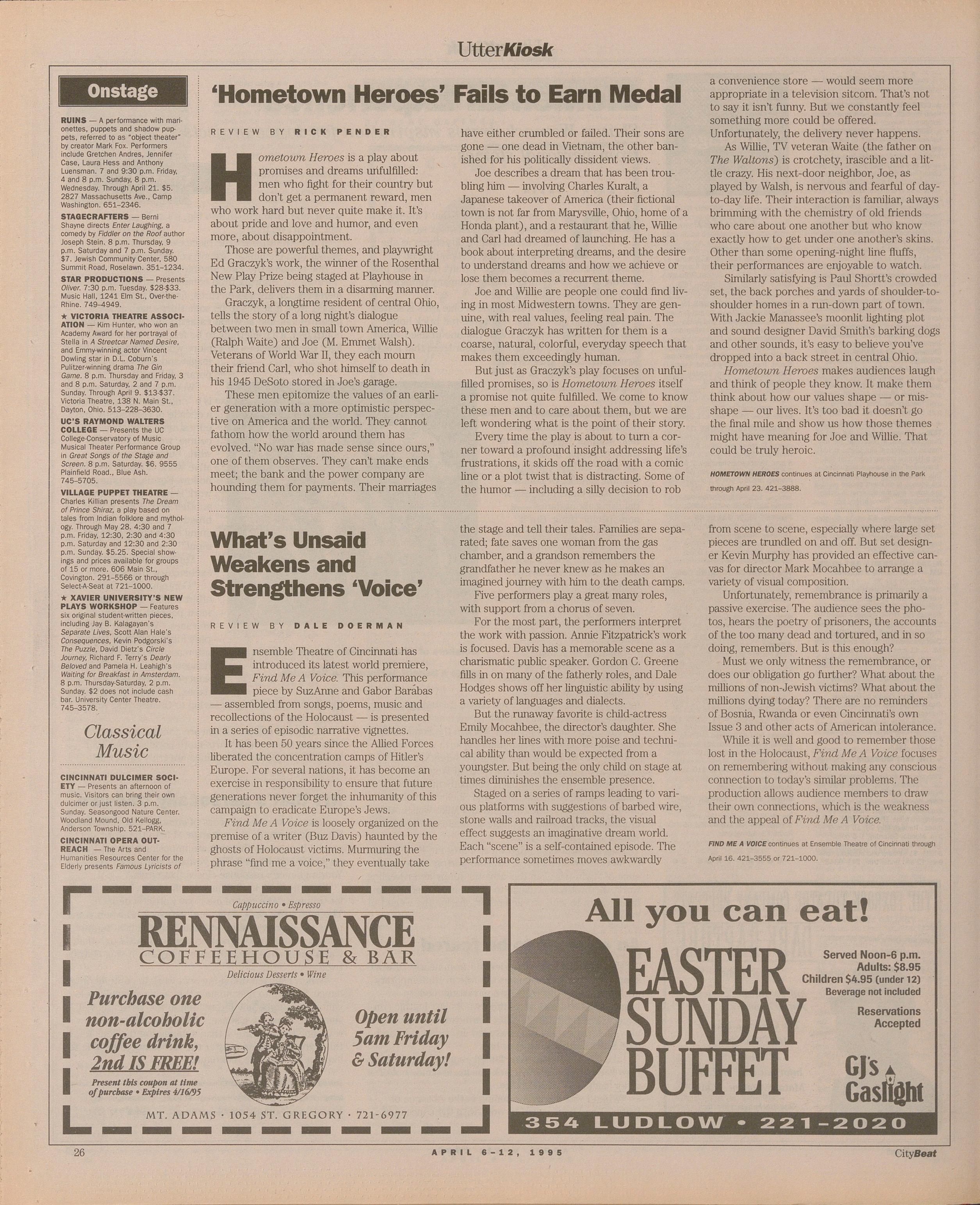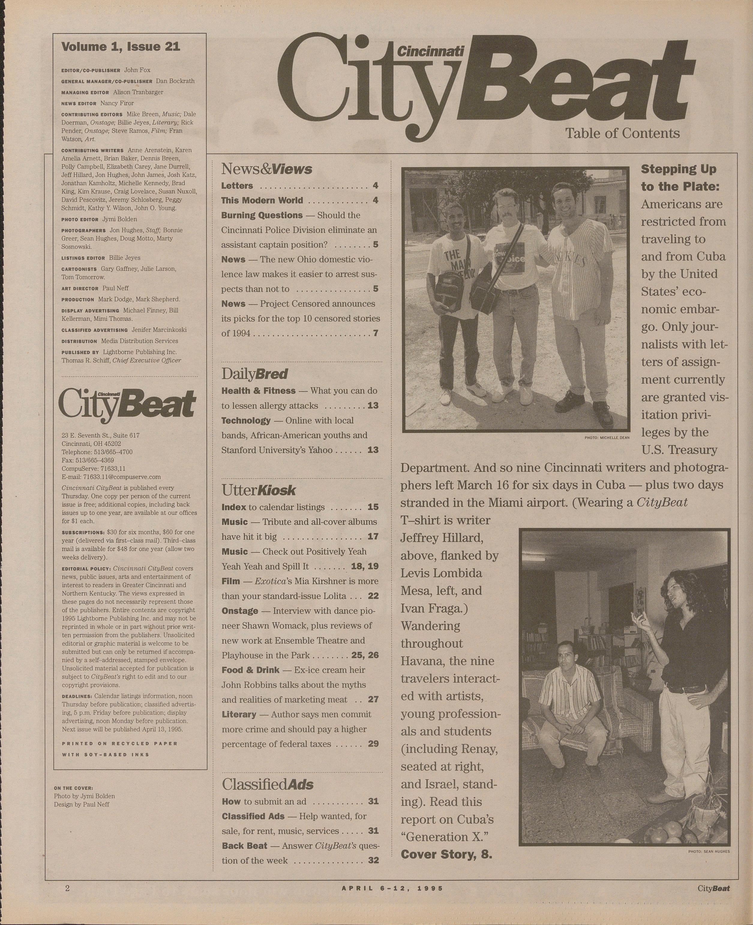 contributing editors Mike Breen, Music; Dale Doerman, Onstage; Billie Jeyes, Literary; Rick Pender, Onstage; Steve Ramos, Film; Fran Watson, Art.
