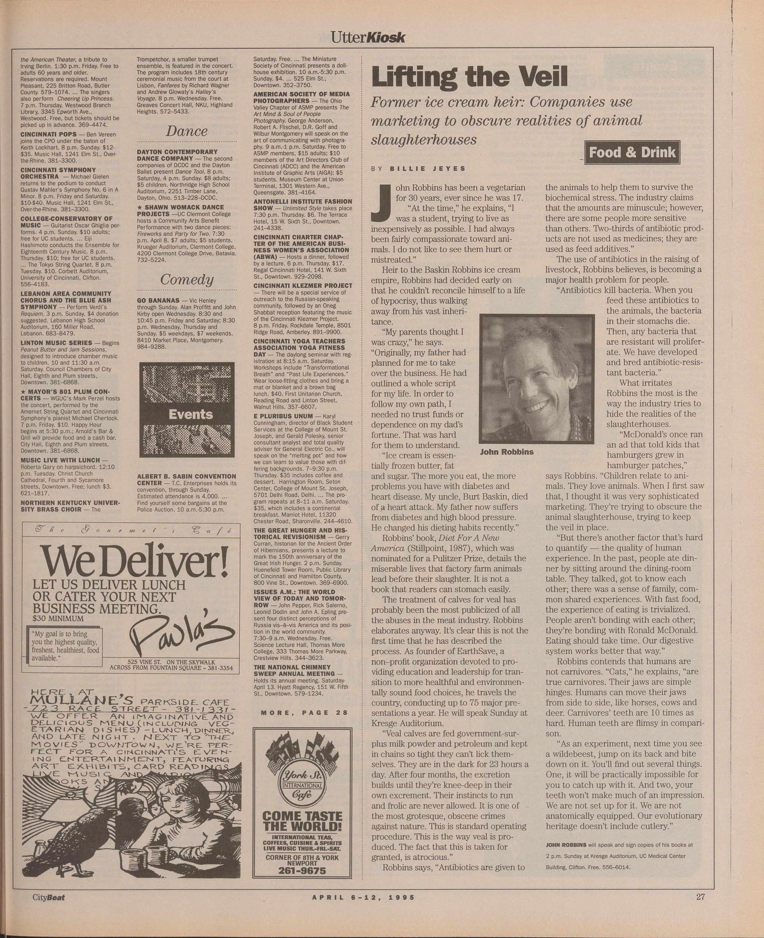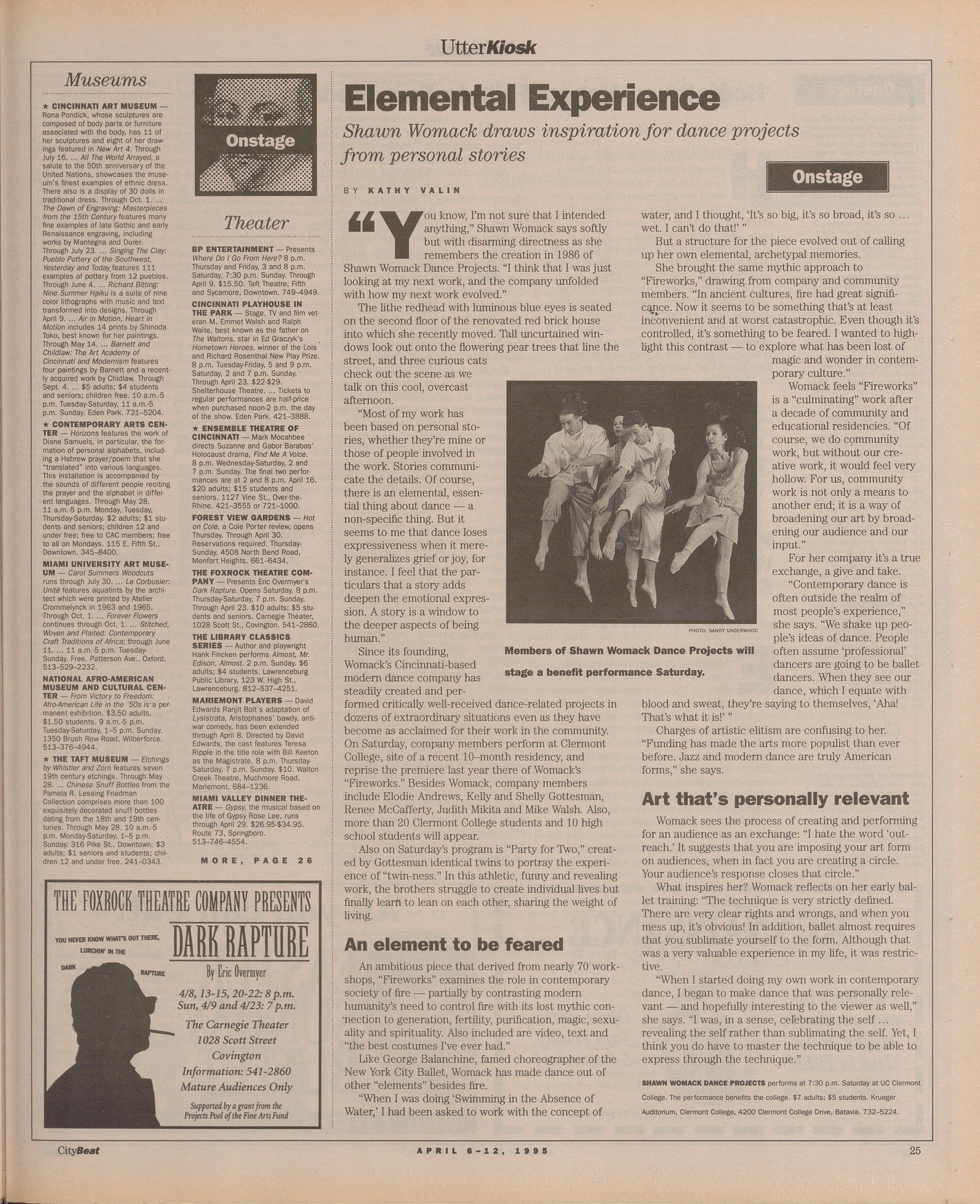 Onstage Interview with dance pioneer Shawn Womack, plus reviews of new work at Ensemble Theatre and Playhouse in the Park 25, 26 Food & Drink Ex-ice cream heir John Robbins talks about the myths