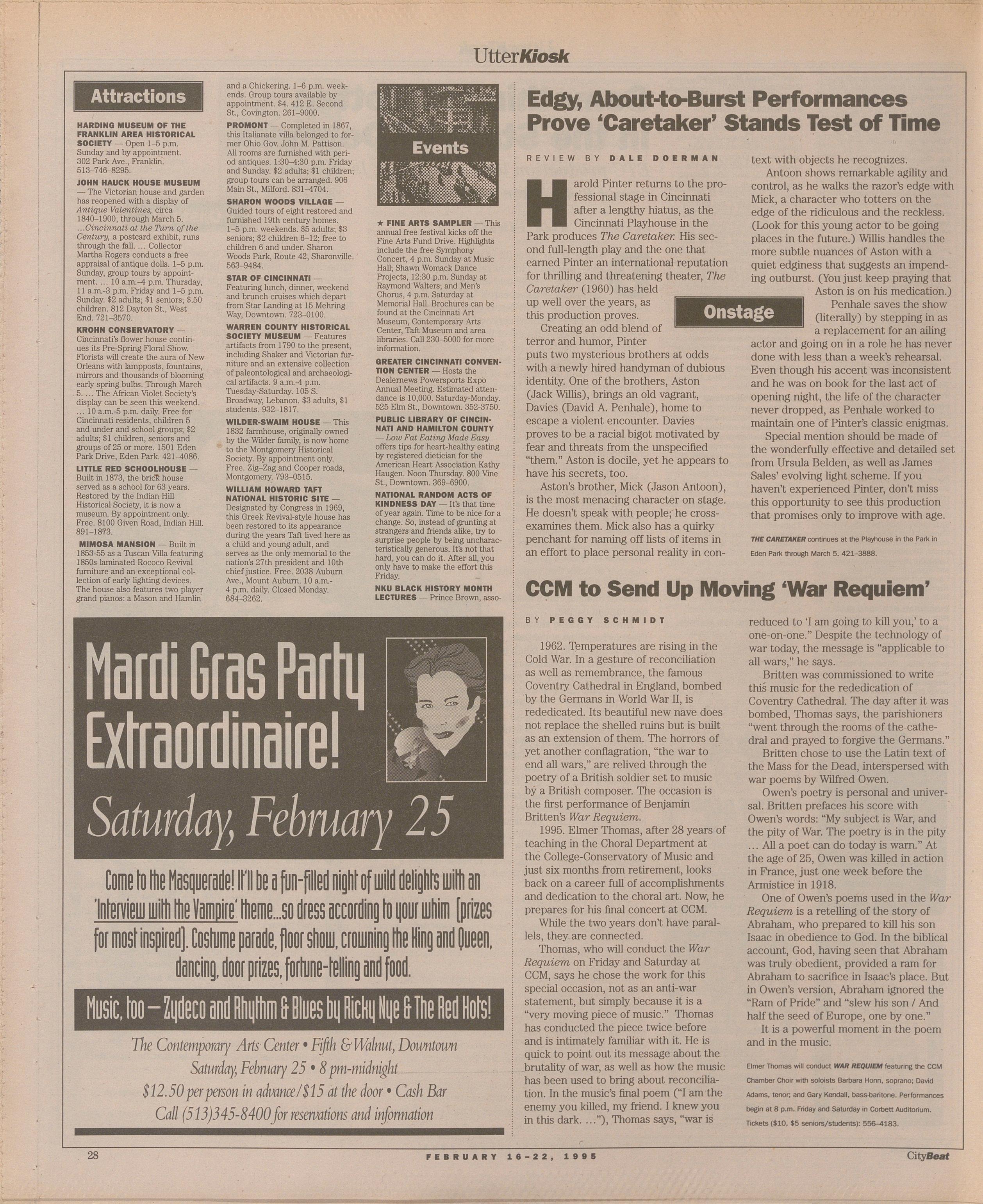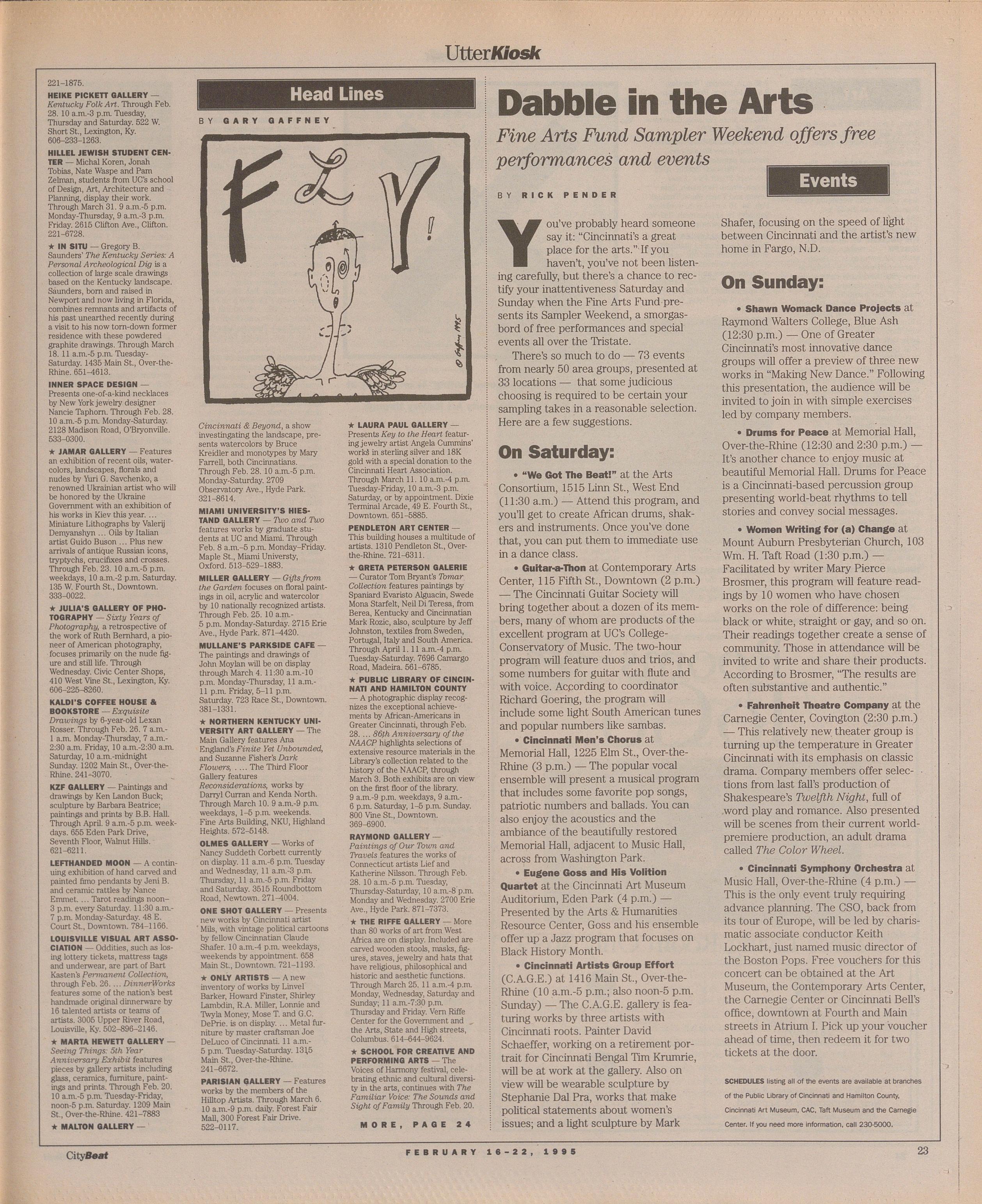 contributing editors Mike Breen, Music; Dale Doerman, Onstage; Rick Pender, Onstage; Steve Ramos, Film Fran Watson, Art