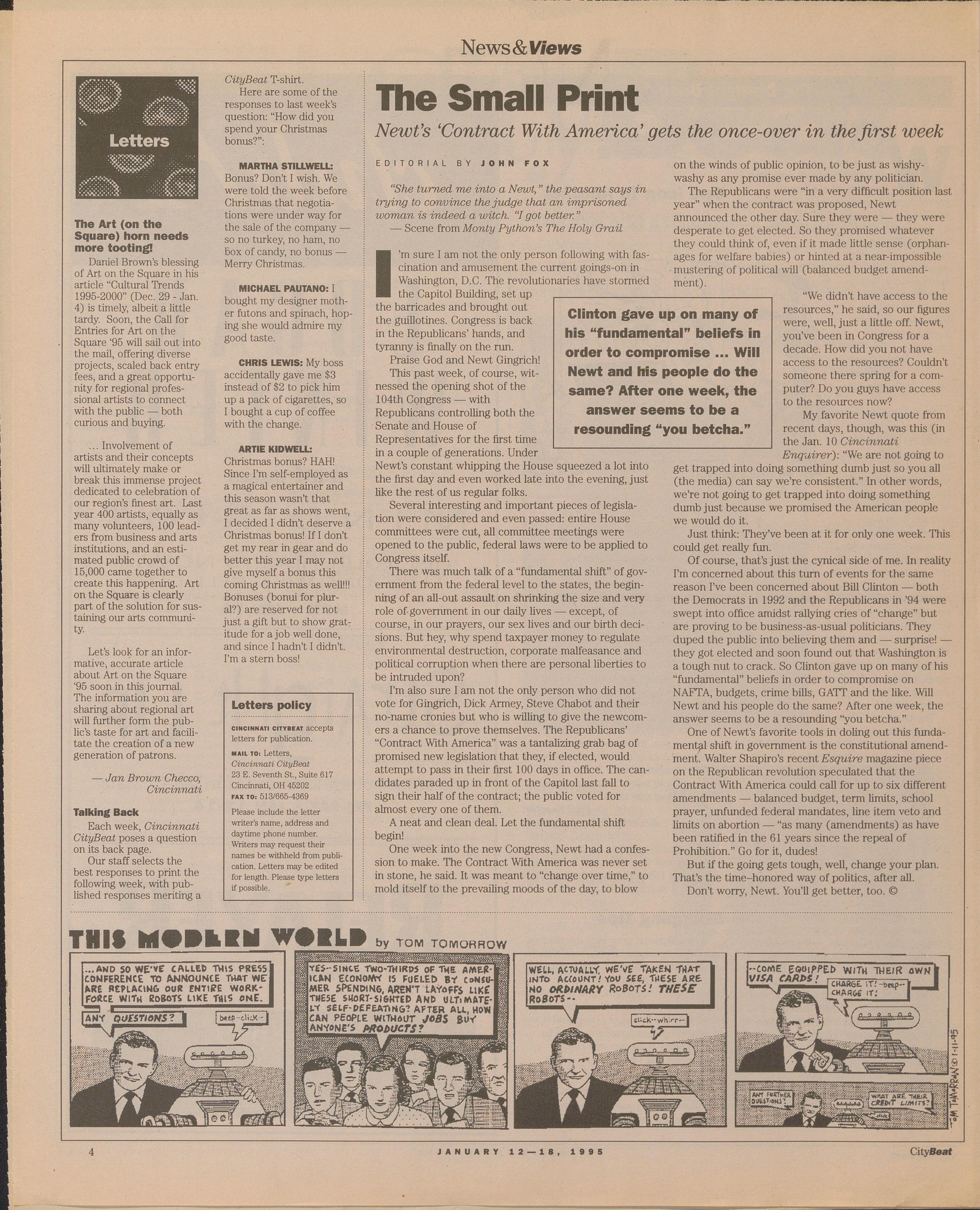 I’m also sure I am not the only person who did not vote for Gingrich, Dick Armey, Steve Chabot and their no-name cronies but who is willing to give the newcomers a chance to prove themselves. The Republicans’ “Contract With America” was a tantalizing grab bag of promised new legislation that they, if elected, would attempt to pass in their first 100 days in office. The candidates paraded up in front of the Capitol last fall to sign their half of the contract; the public voted for almost every one of them.