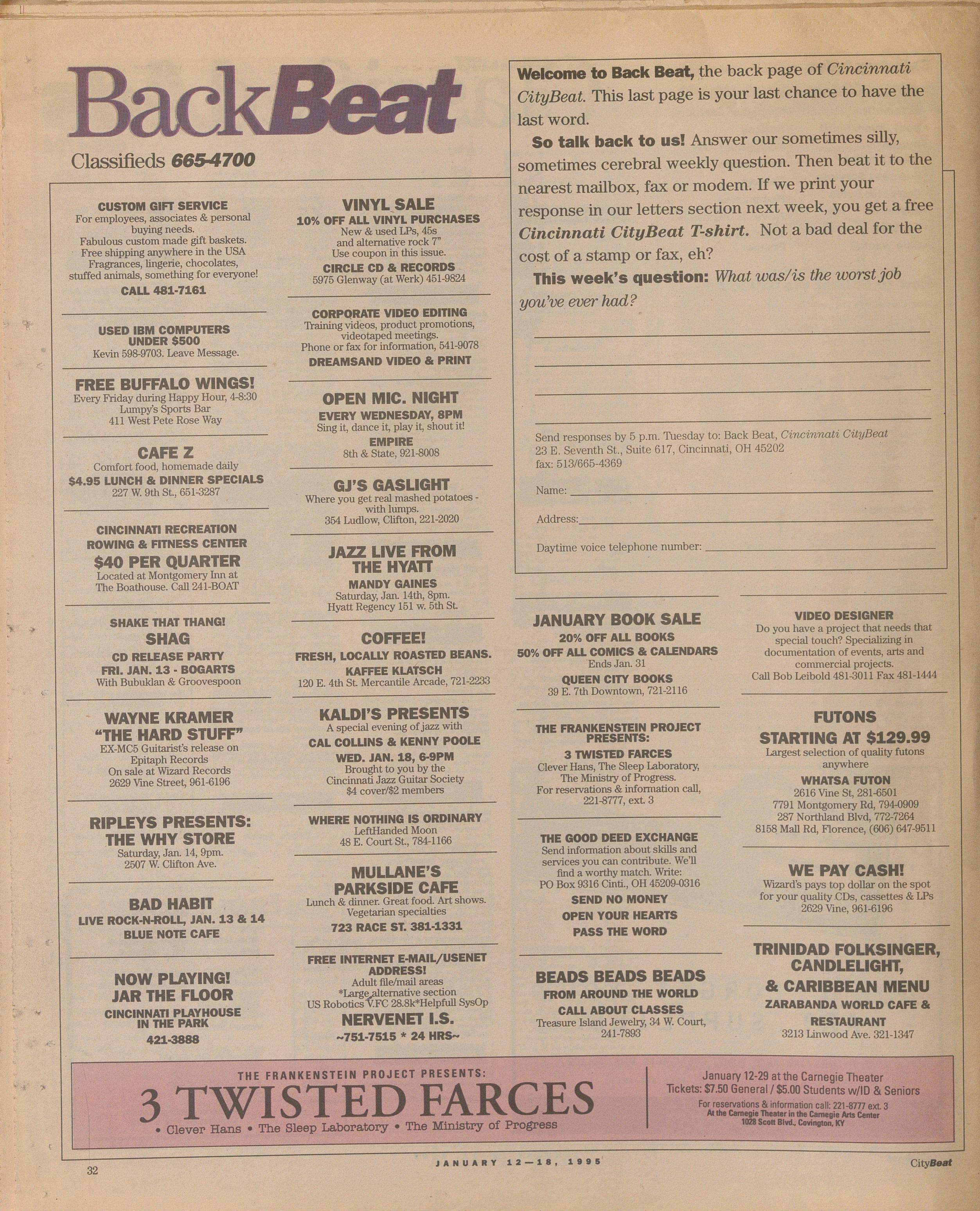 Welcome to Back Beat, the back page of Cincinnati CityBeat. This last page is your last chance to have the last word.