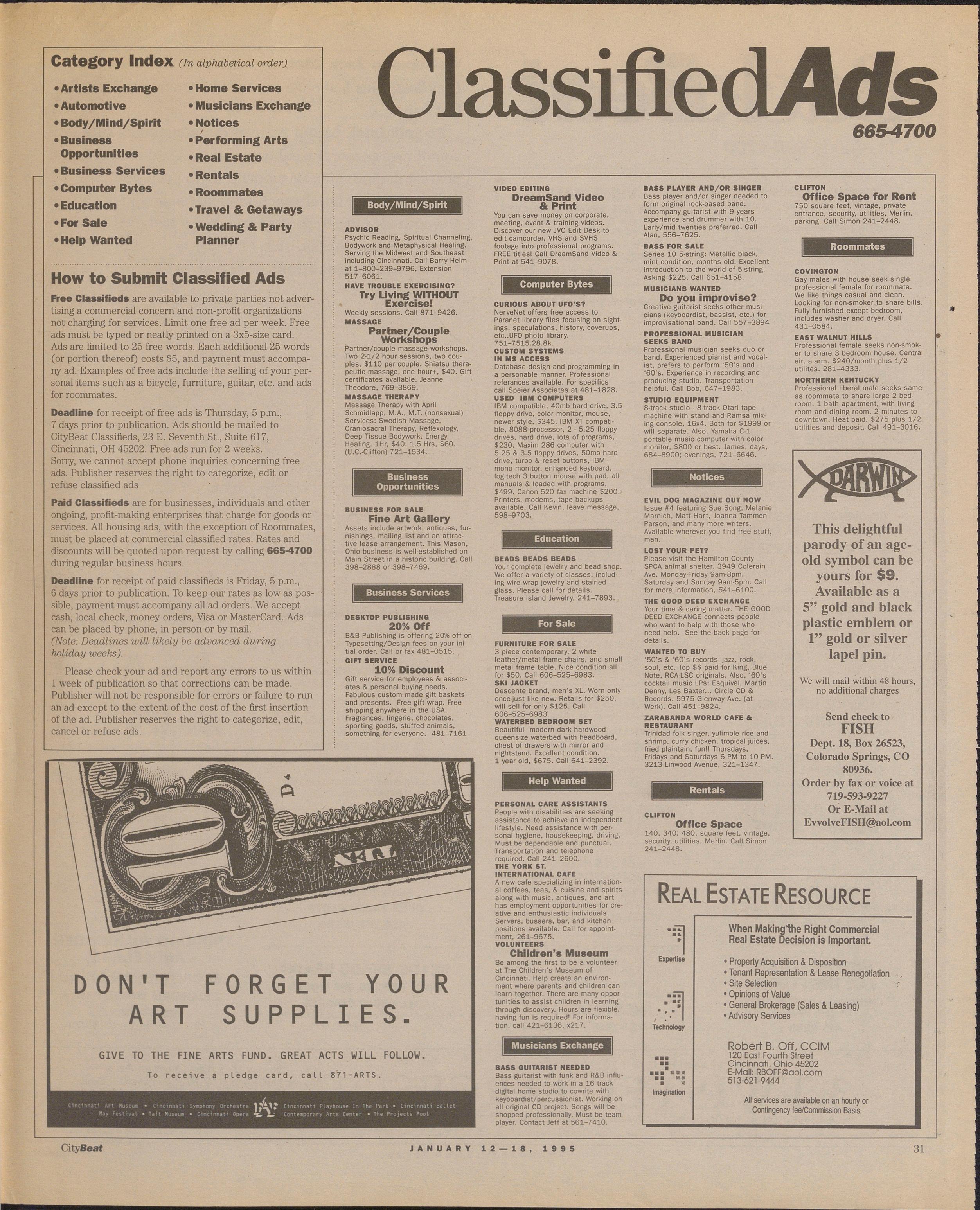 Deadline for receipt of free ads is Thursday, 5 p.m., 7 days prior to publication. Ads should be mailed to CityBeat Classifieds, 23 E. Seventh St., Suite 617, Cincinnati, OH 45202. Free ads run for 2 weeks. Sorry, we cannot accept phone inquiries concerning free ads. Publisher reserves the right to categorize, edit or refuse classified ads