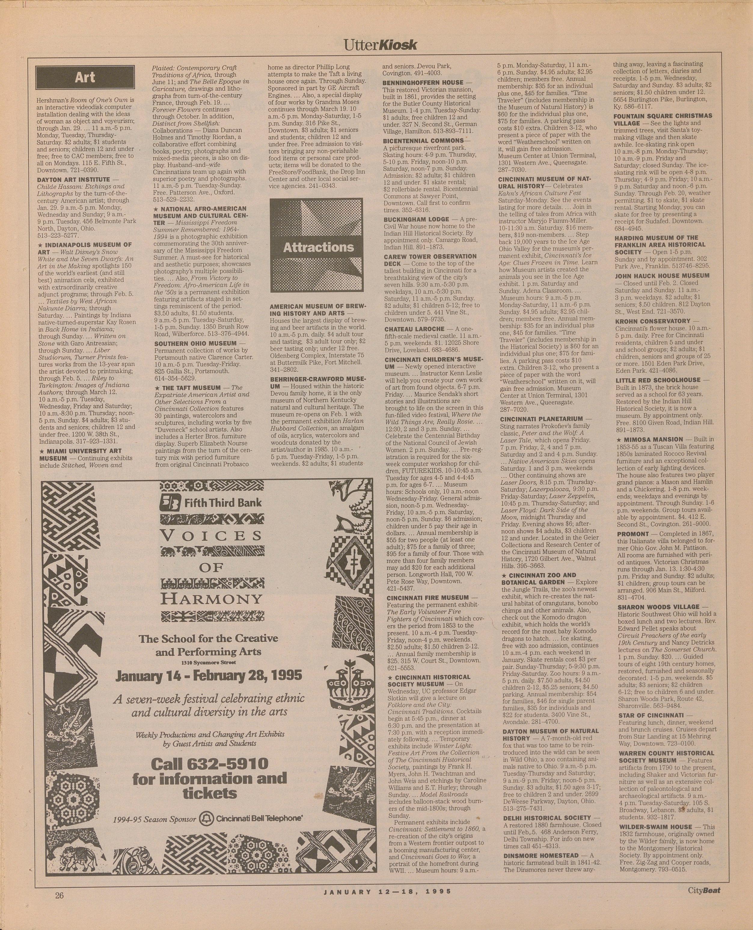 THE BALTIMORE WALTZ— Paula Vogel’s play, which won the Obie for Best Play of 1991-92, premieres in Cincinnati featuring Poor Superman’s David Schaplowsky. All proceeds go to AVOC via The Imperial Sovereign Queen City Court of the Buckeye Empire of All Ohio Inc. Jan. 19-21 and 26-28. 1425 Sycamore, Over-the-Rhine. 921-1168.