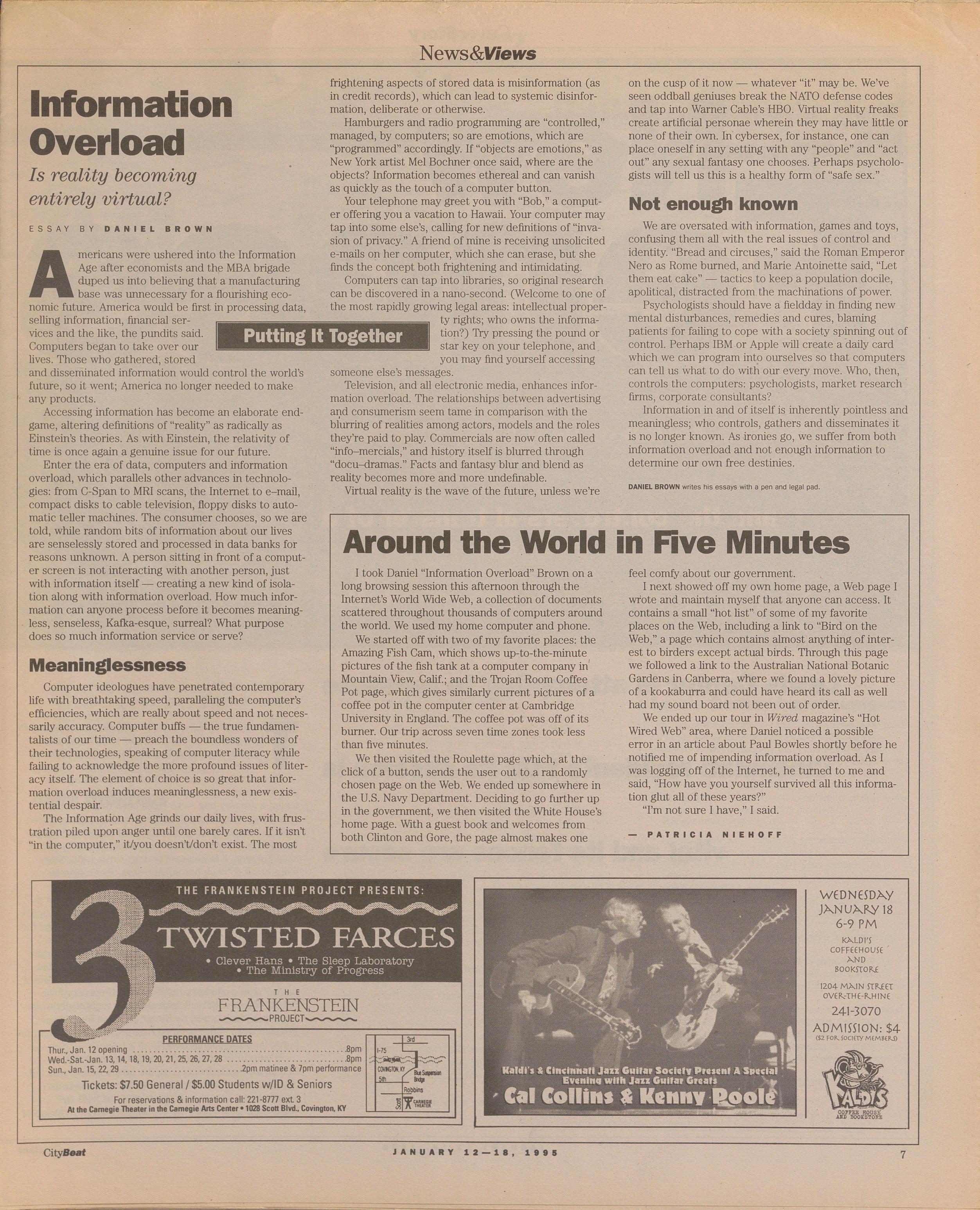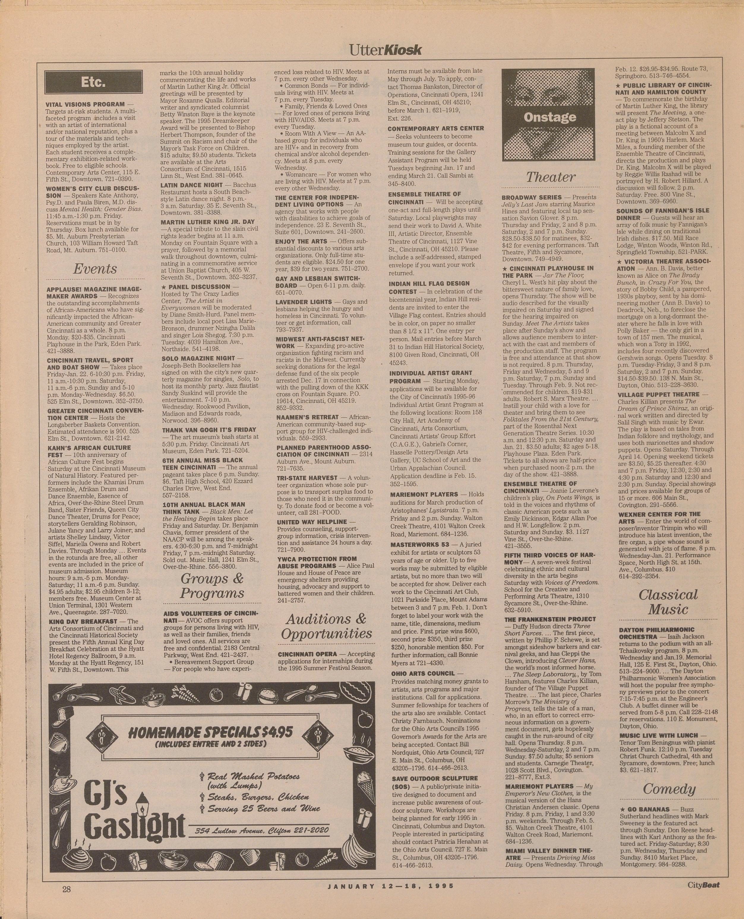 deadlines: Calendar listings information, noon Thursday before publication; classified advertising, 5 p.m. Friday before publication; display advertising, noon Monday before publication. Next issue will be published Jan. 19, 1995.