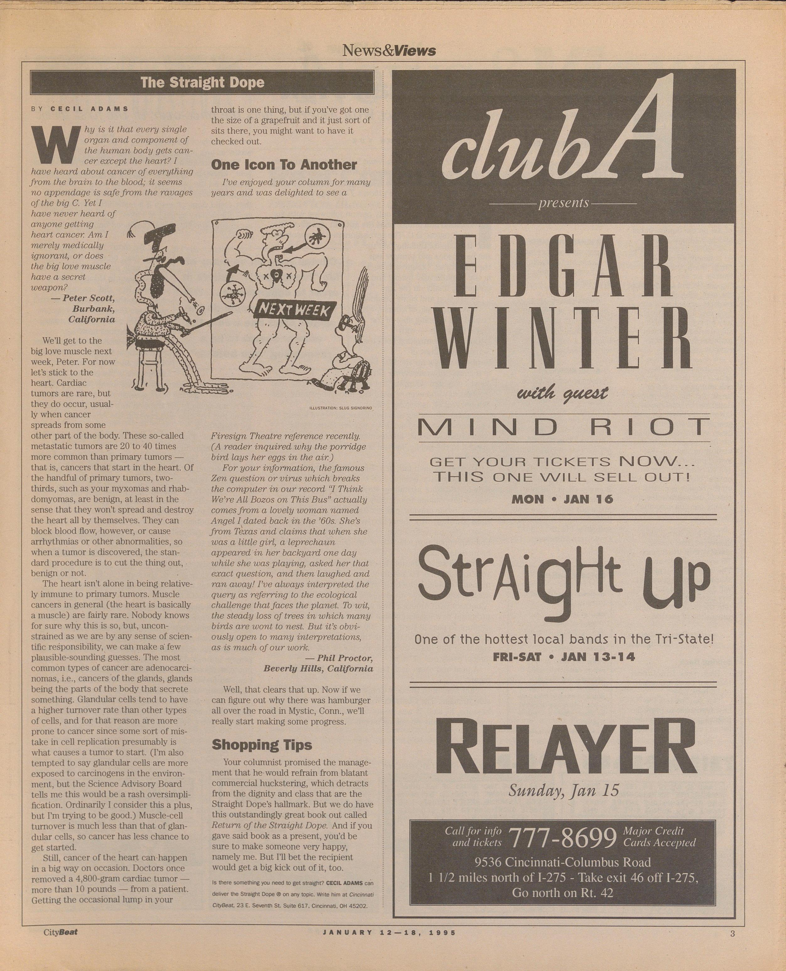 Is there something you need to get straight? CECIL ADAMS can deliver the Straight Dope ® any topic. Write him at Cincinnati CityBeat. 23 E. Seventh St. Suite 617, Cincinnati. OH 45202.