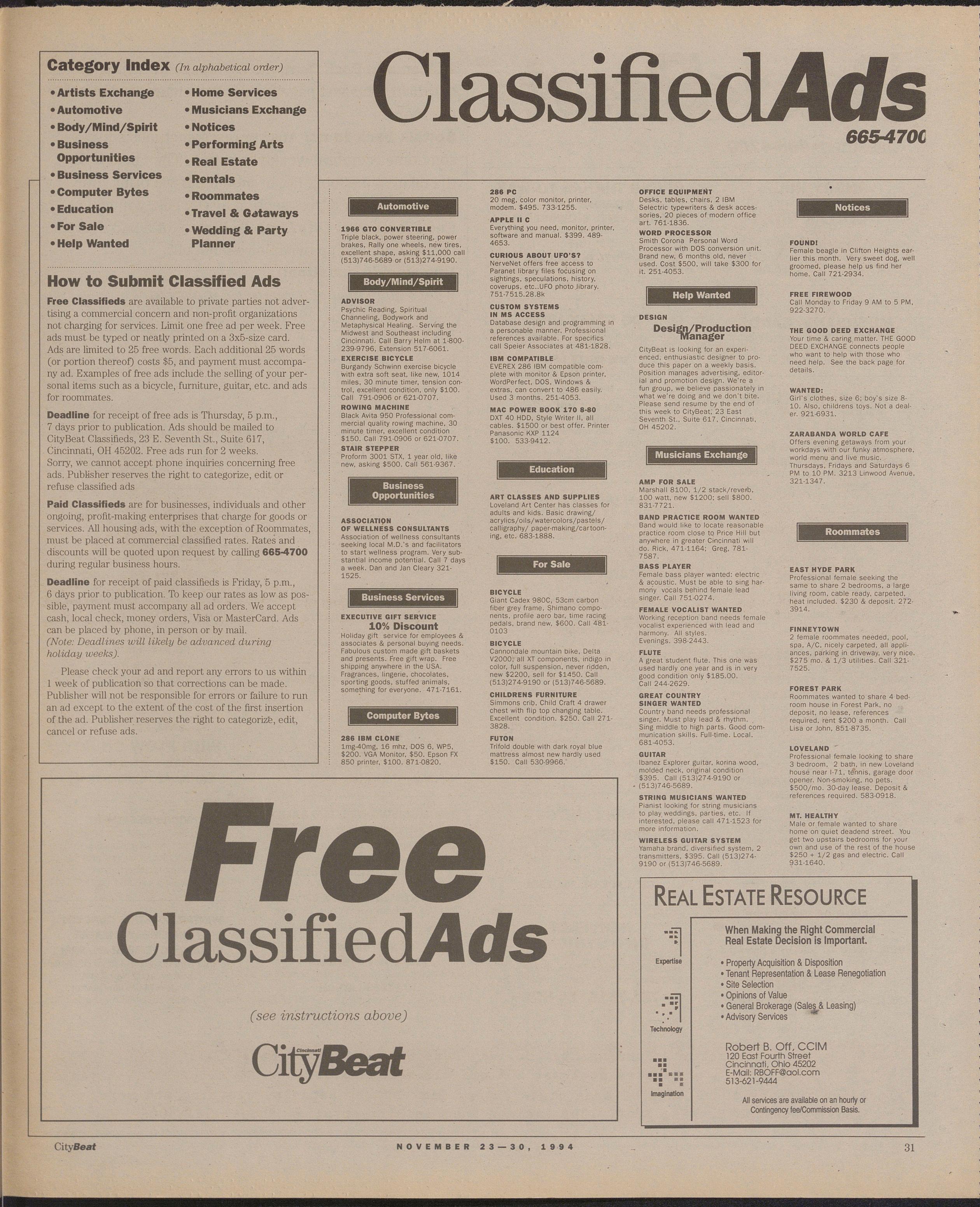 Deadline for receipt of free ads is Thursday, 5 p.m., 7 days prior to publication. Ads should be mailed to CityBeat Classifieds, 23 E. Seventh St., Suite 617, Cincinnati, OH 45202. Free ads run for 2 weeks.