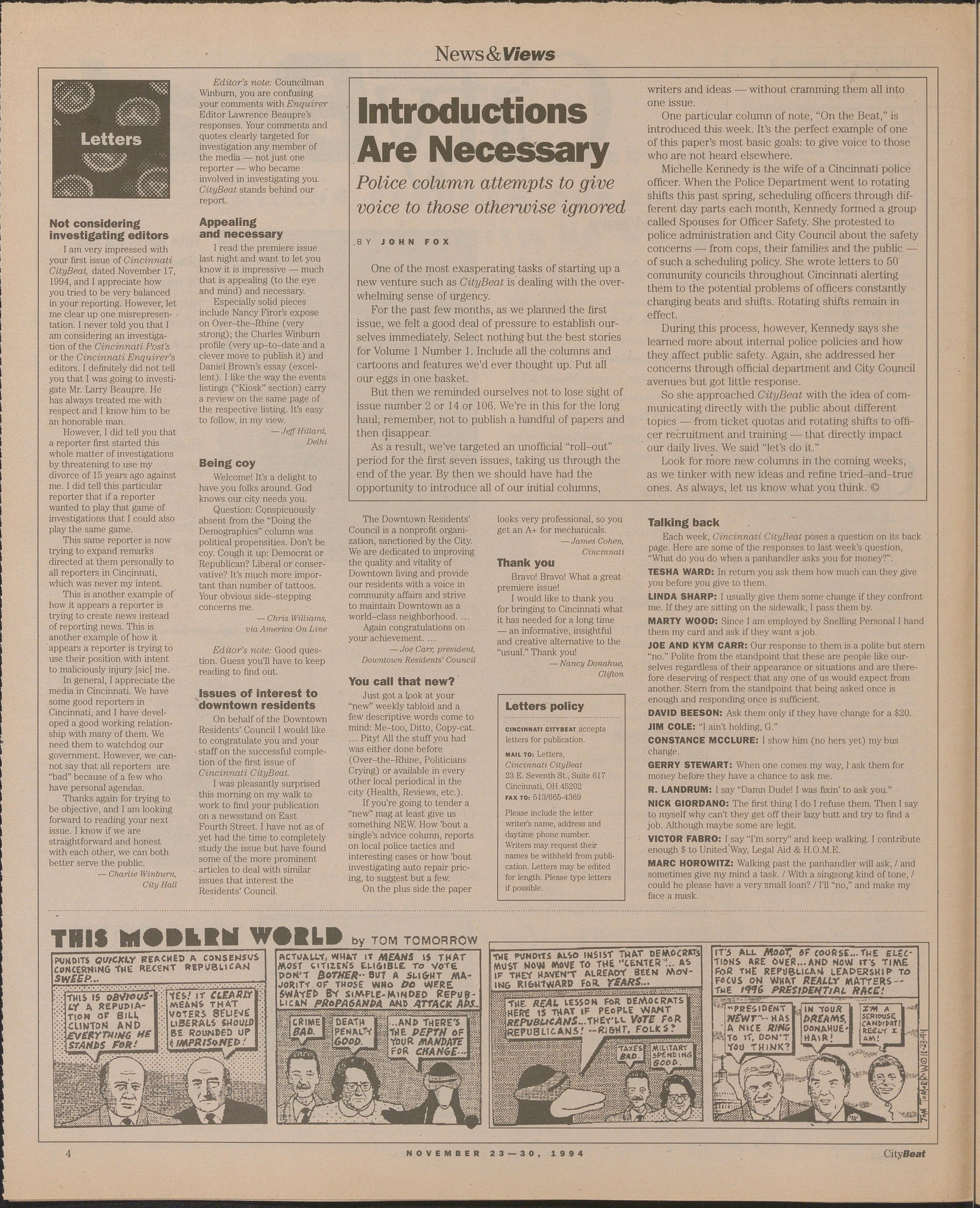 I am very impressed with your first issue of Cincinnati CityBeat, dated November 17, 1994, and I appreciate how you tried to be very balanced in your reporting. However, let me clear up one misrepresentation. I never told you that 1 am considering an investigation of the Cincinnati Post’s or the Cincinnati Enquirer’s editors. I definitely did not tell you that I was going to investigate Mr. Larry Beaupre. He has always treated me with respect and I know him to be an honorable man.