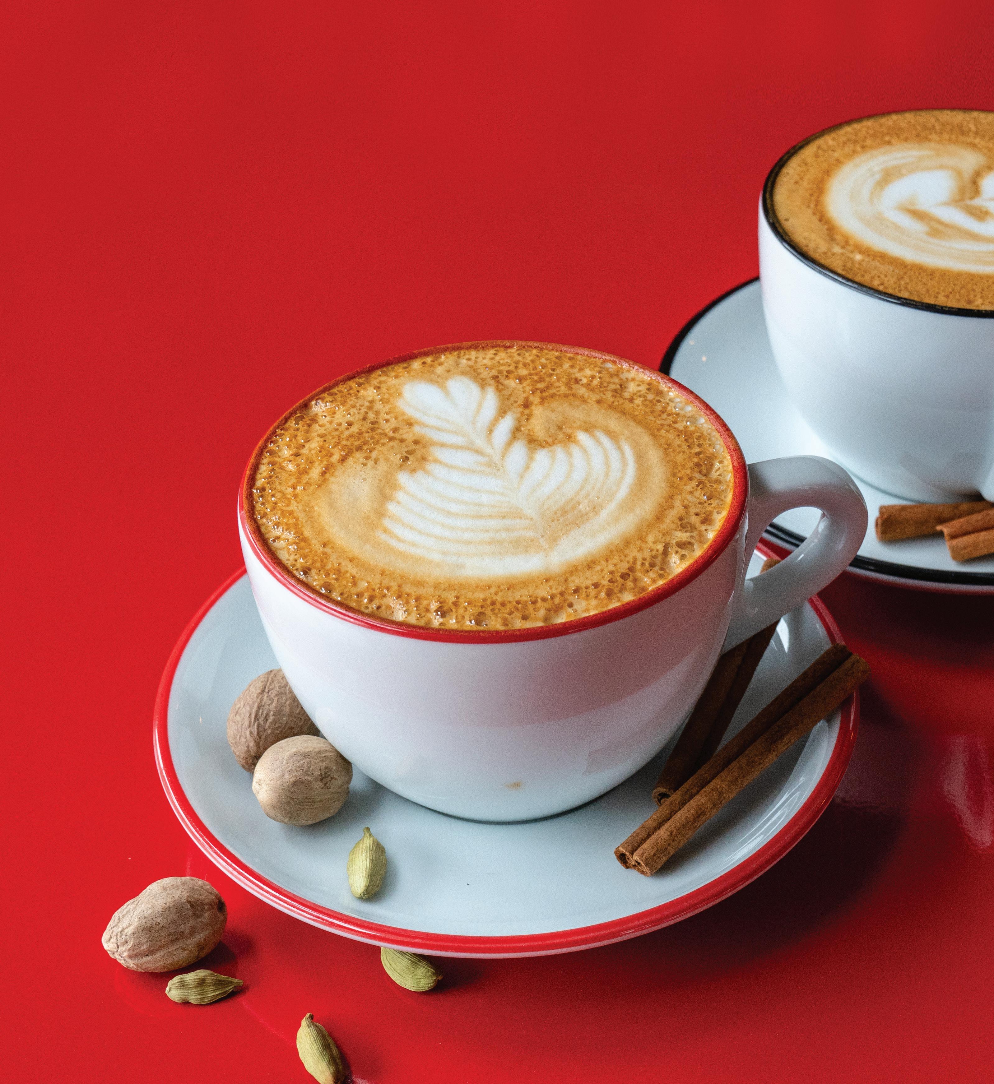 opposite page: baked goods and a cappuccino at the annex coffee and foods; clockwise, from top: dishes at diego's, the interior at khanna's desi vibes, dal with butter naan at khanna's desi vibes, pravin khanna, the patio at the annex coffee and foods