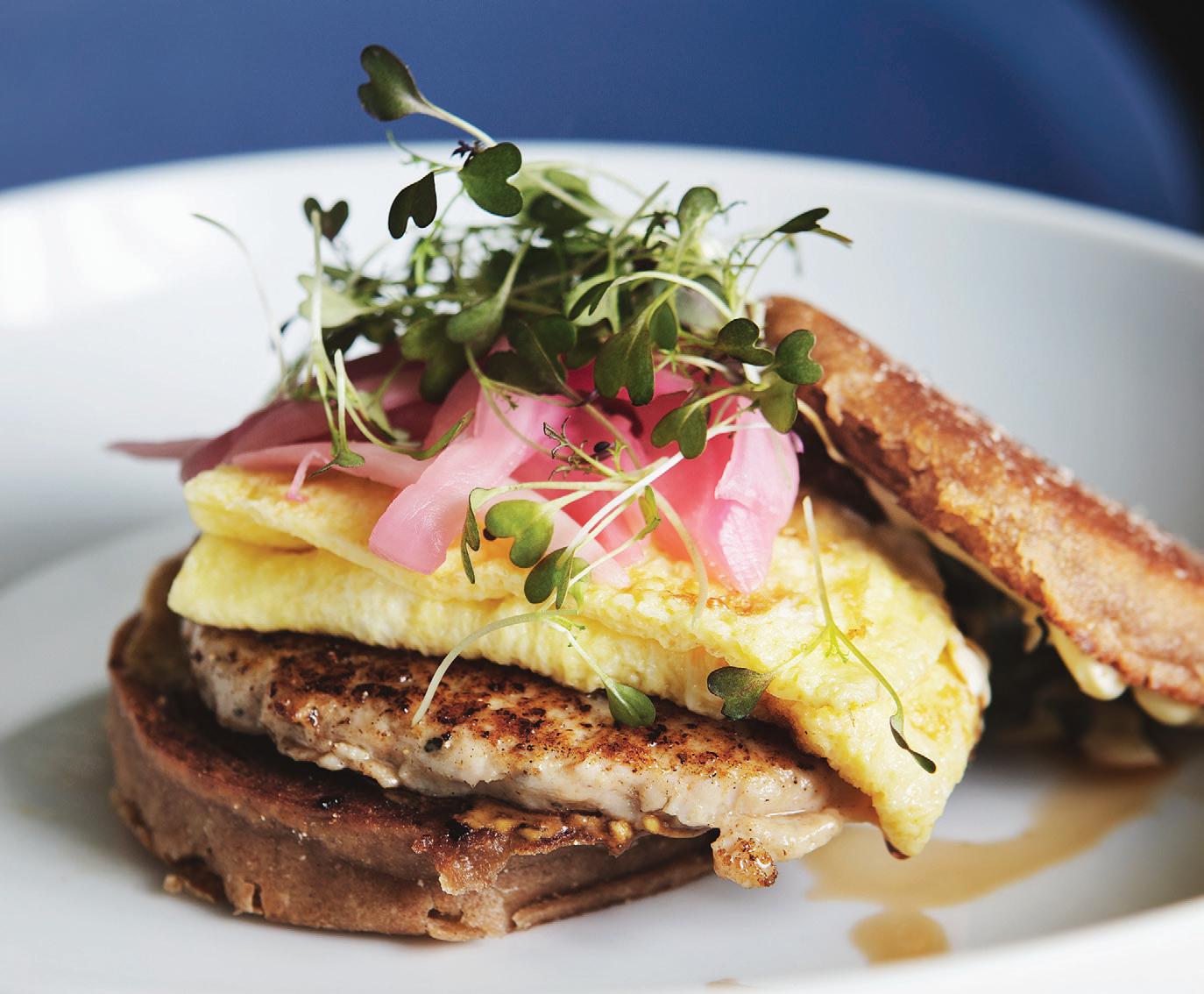 shrimp and grits, which are velvety, mildly spicy and balanced by green pepper and okra. They also make an excellent accompaniment as a side for the biscuit sandwich, another must-try item. Served with egg, cheese, apricot-red onion jam and your choice of protein, Ferguson’s biscuits shine just as brightly as her grits. Made with White Lily flour (the flour of choice for generations of Southern biscuit-bakers), they’re sturdy enough to hold the sandwich components while retaining their soft, flaky interiors.