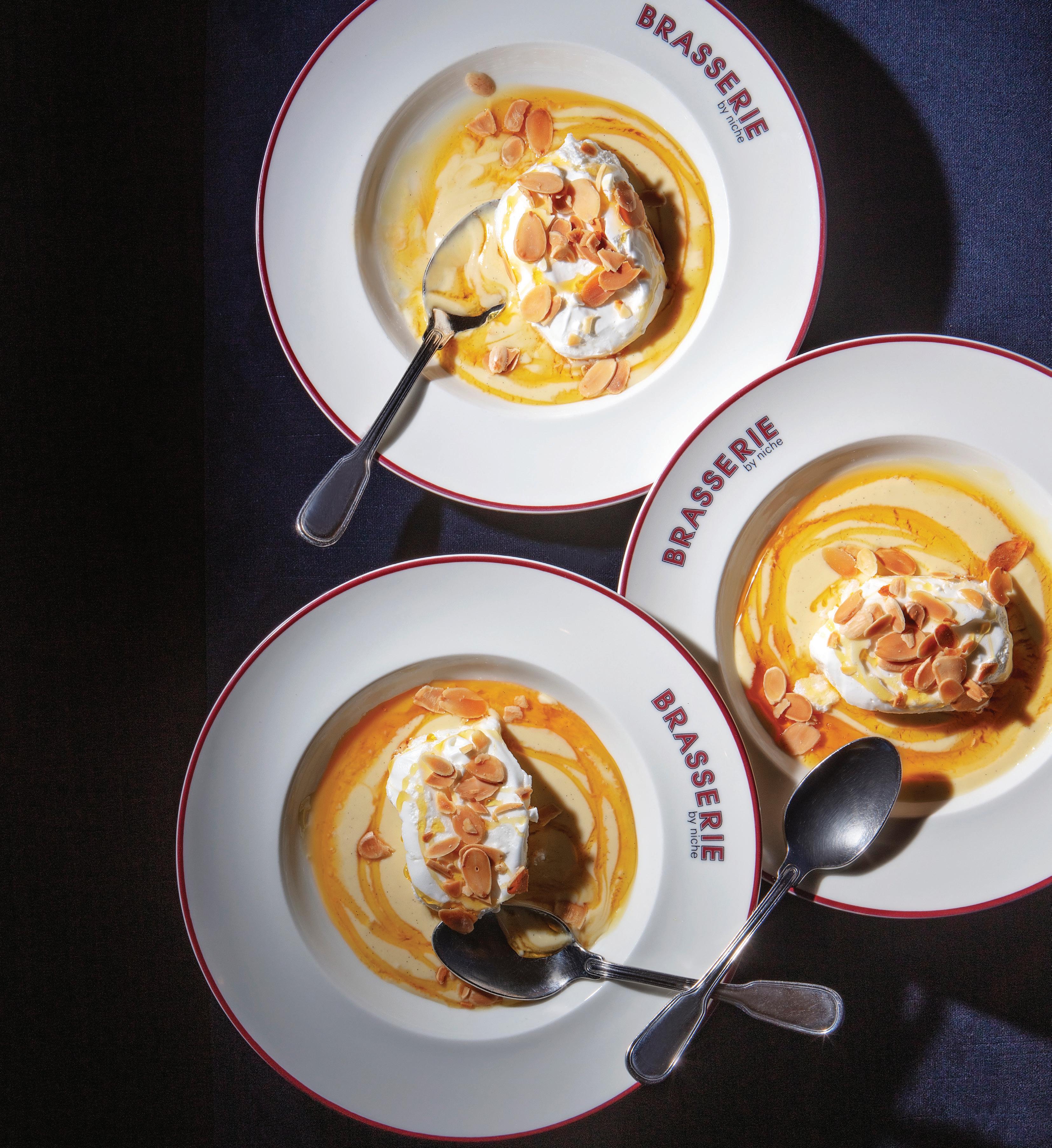 The Floating Island dessert at Brasserie by Niche is impossibly light and on the knife’s edge of sweetness. Fluffy clouds of poached, soft meringue float on top of a pool of vanilla-scented crème anglaise garnished with a ribbon of caramel and toasted almond slices for a satisfying crunch. We always have room for this ethereal dessert.