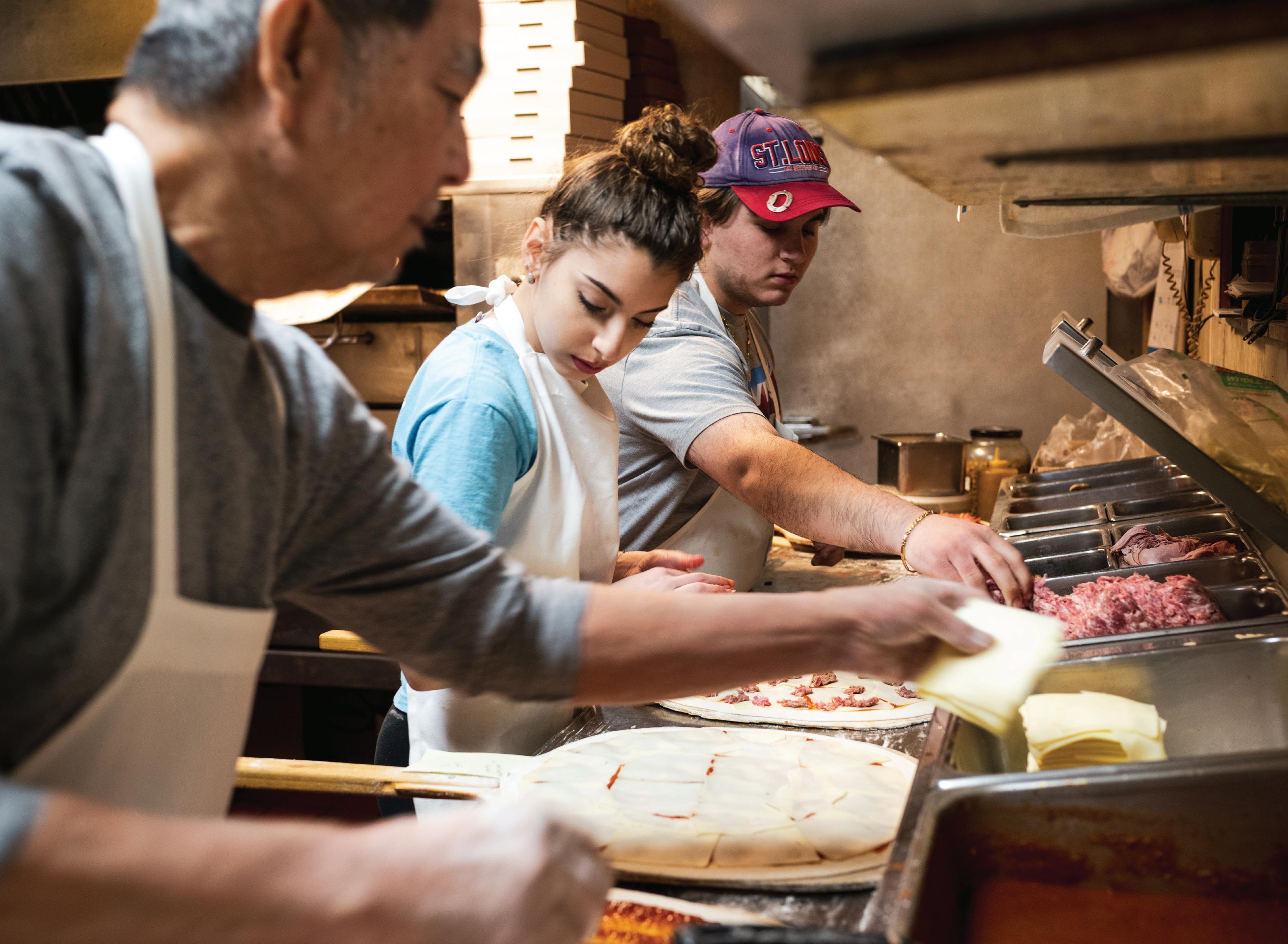 this page, top: serra's supreme pizza; opposite page: from left, remy martin, gabriela serra and vincenzo randazzo
