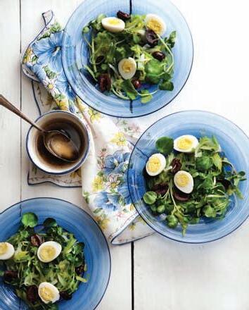 1 bunch watercress, washed, dried and tough stalks removed 20 Kalamata olives, halved lengthwise 8 quail eggs, hard-boiled (or soft-boiled), peeled and halved