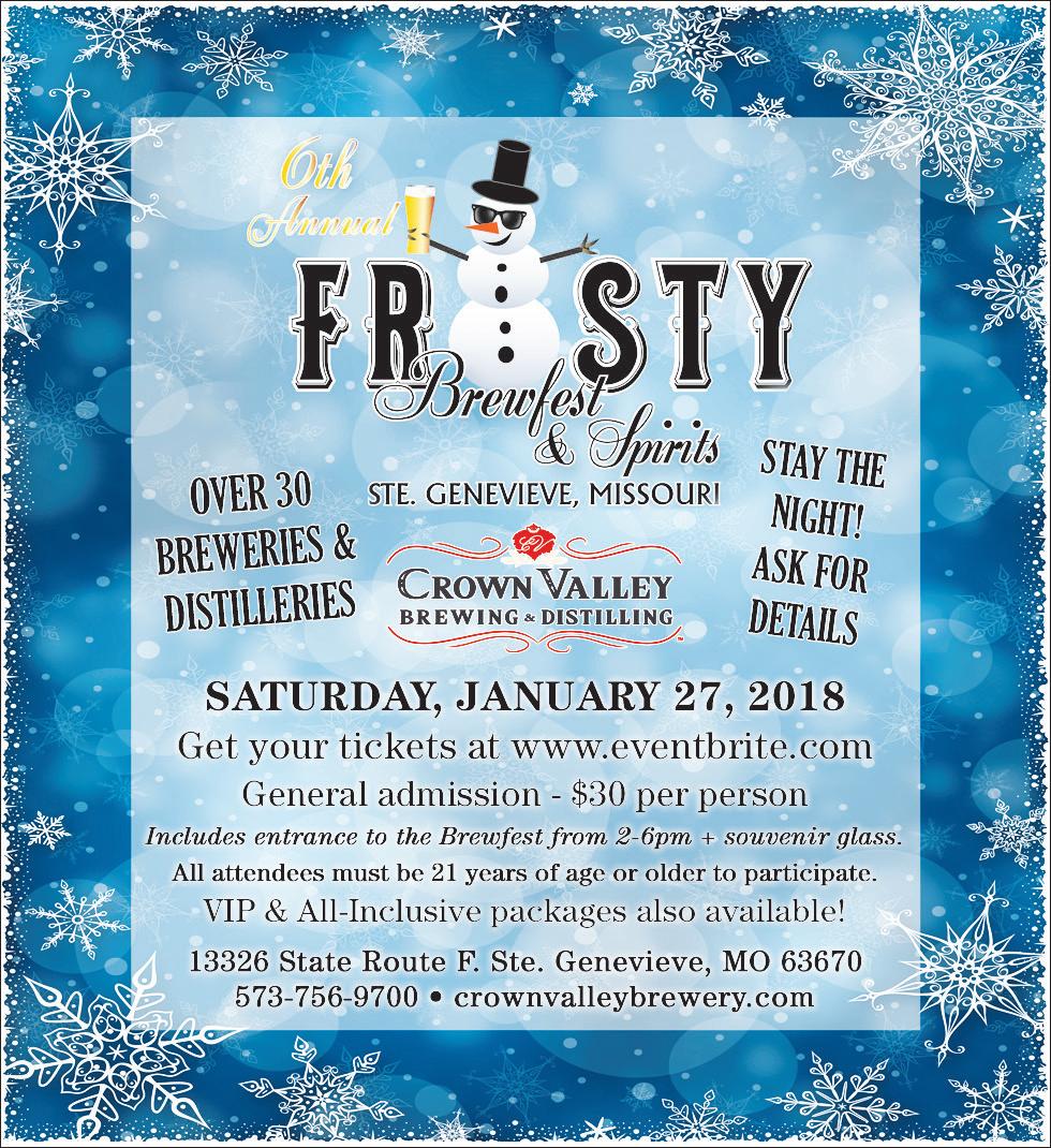 Jan. 27 – 2 to 6 p.m., Crown Valley Brewing & Distilling, 13326 State Highway F, Ste. Genevieve, 573.756.9463, crownvalleybrewery.com It may be cold outside, but Crown Valley Brewery is warming things up in Ste. Genevieve at its annual winter beer fest. Sample beers and spirits from some of the region’s top producers, like Schlafly, Urban Chestnut Brewing Co., Jackson Street BrewCo and Main & Mill. Enjoy a special lunch plate available for purchase while you drink in front of the roaring fire pit and listen to live music courtesy of Scotty Kemp. Tickets available online.
