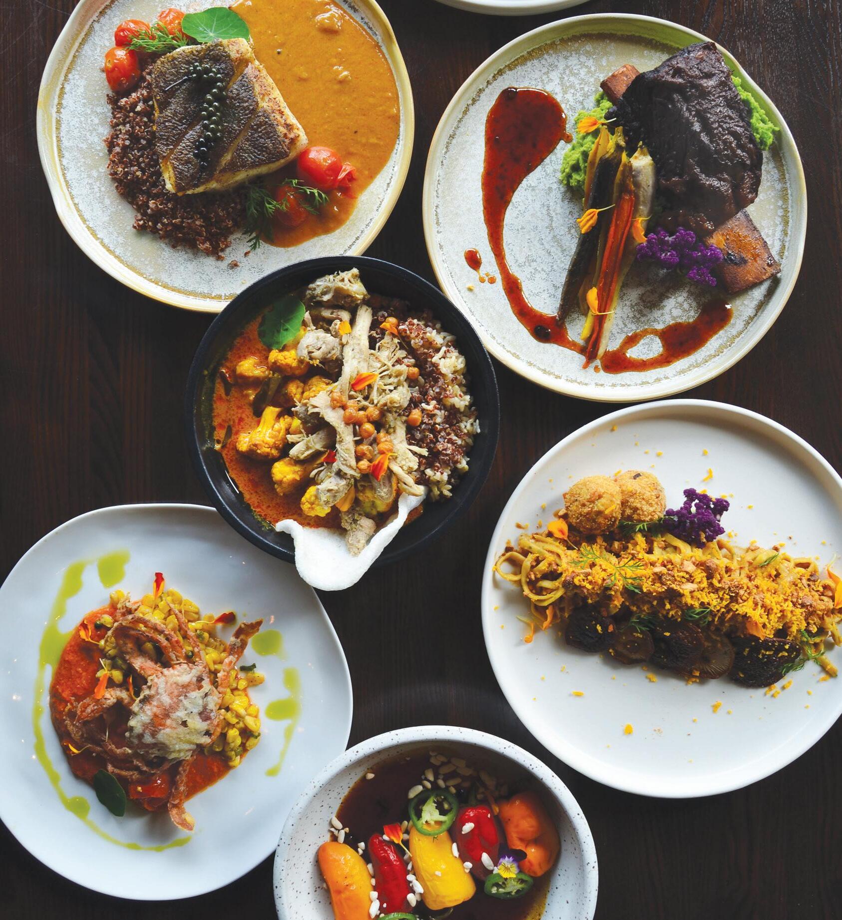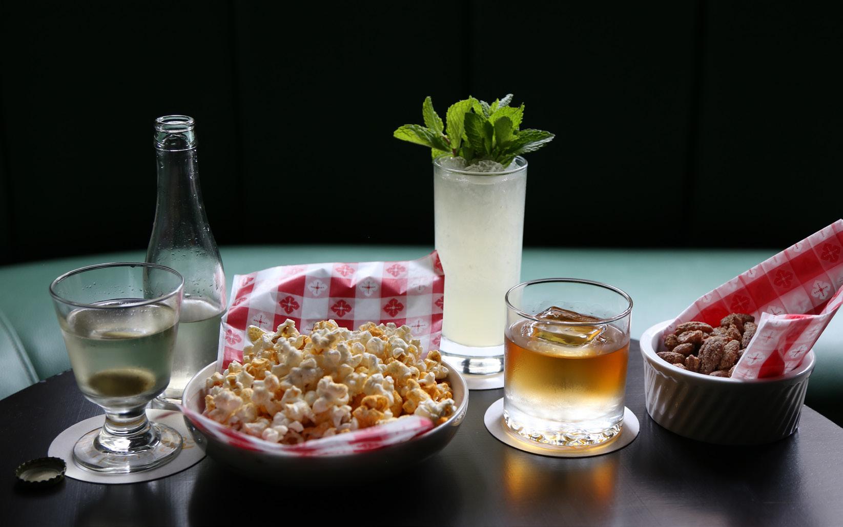 clockwise from bottom left: bemiston cocktail club beverage director ryan miller; drinks and snacks at bemiston cocktail club; akar chef-owner bernie lee and teammate samantha pretto; the dining room at akar