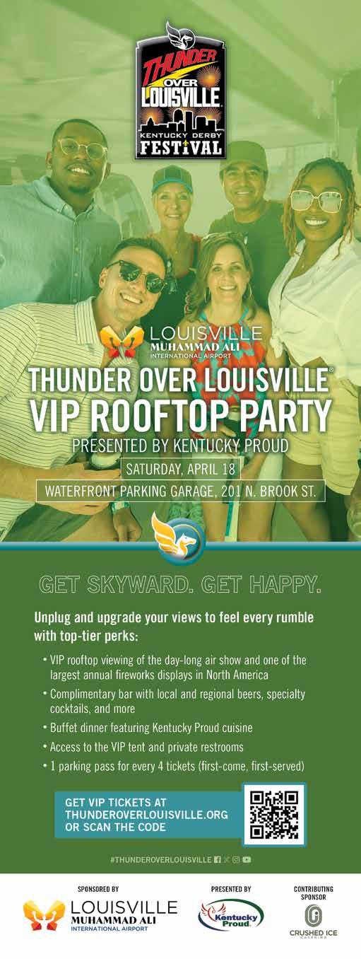 The riverfront is transformed into an all-day spectacle with the Thunder Chow Wagon, family zones, and prime lawn viewing areas during the biggest annual fireworks show and air display in the country. Don’t bring drones, tents, grills, pets, or bikes to the event; instead, wear your Pegasus Pin to gain entry to important locations. A little planning goes a long way toward enjoying Derby season’s biggest day!