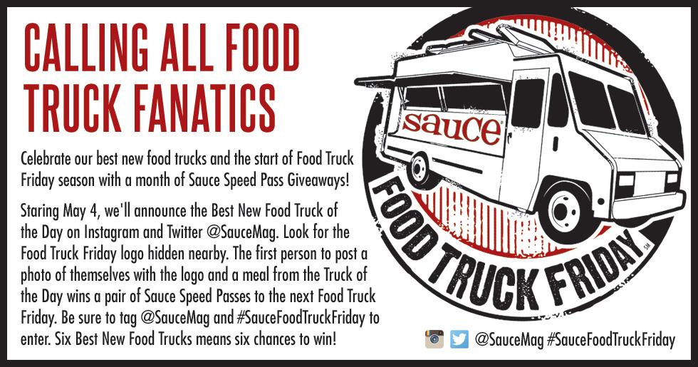 Starting May 4, we’ll announce the Best New Food Truck of the Day on Instagram and Twitter @ SauceMag. Grab lunch from that truck, and while you’re there, look for the Food Truck Friday logo hidden nearby. (Hint: Check trees, benches, parking meters, etc.)
