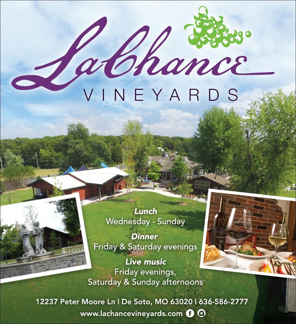 winery offering unique, Europeanstyle wines produced with new experimental varieties of grapes, like Crimson Cabernet and Dore, grown at LaChance and also available in Kimmswick. The DeSoto location also provides a full menu of food offerings. You can also catch live music every weekend at both locations. 12237 Peter Moore Lane, De Soto, 636.586.2777; 6035 Second St., Kimmswick, 636.223.0453, lachancevineyards.com