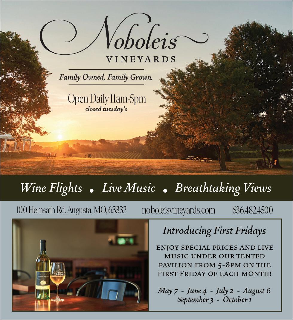 Situated on 84 acres in the first designated AVA in the country, Noboleis Vineyards offers panoramic views of the historic, rolling hills of Augusta. Grab a bottle of one of their award-winning wines grown in the region and produced right on property. Nosh on pizza and appetizers or pack your own picnic basket to enjoy on the lawn or under the tented pavilion. Live music every Saturday and Sunday from April through October adds to the beautiful atmosphere created at Noboleis, which is open daily from 11 a.m. to 5 p.m. and closed on Tuesdays. 100 Hemsath Road, Augusta, 636.482.4500, noboleisvineyards.com