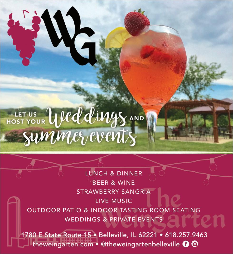Located just 20 minutes outside downtown St. Louis, The Weingarten is your relaxation destination. With acres of beautiful farm-scape to enjoy, this family friendly Winery and Event Venue is the perfect location for your next celebration or day out! Choose from a list of wines from around the world or craft beer to pair with an offering of delicious lunch and dinner items on the menu. Make sure to try a seasonal favorite, the Strawberry Sangria, while listening to live music every weekend in the indoor tasting room or beautiful patio. The events calendar boasts a variety of fun, like the Catalina Wine Mixer in August! Create some memories this year at The Weingarten!