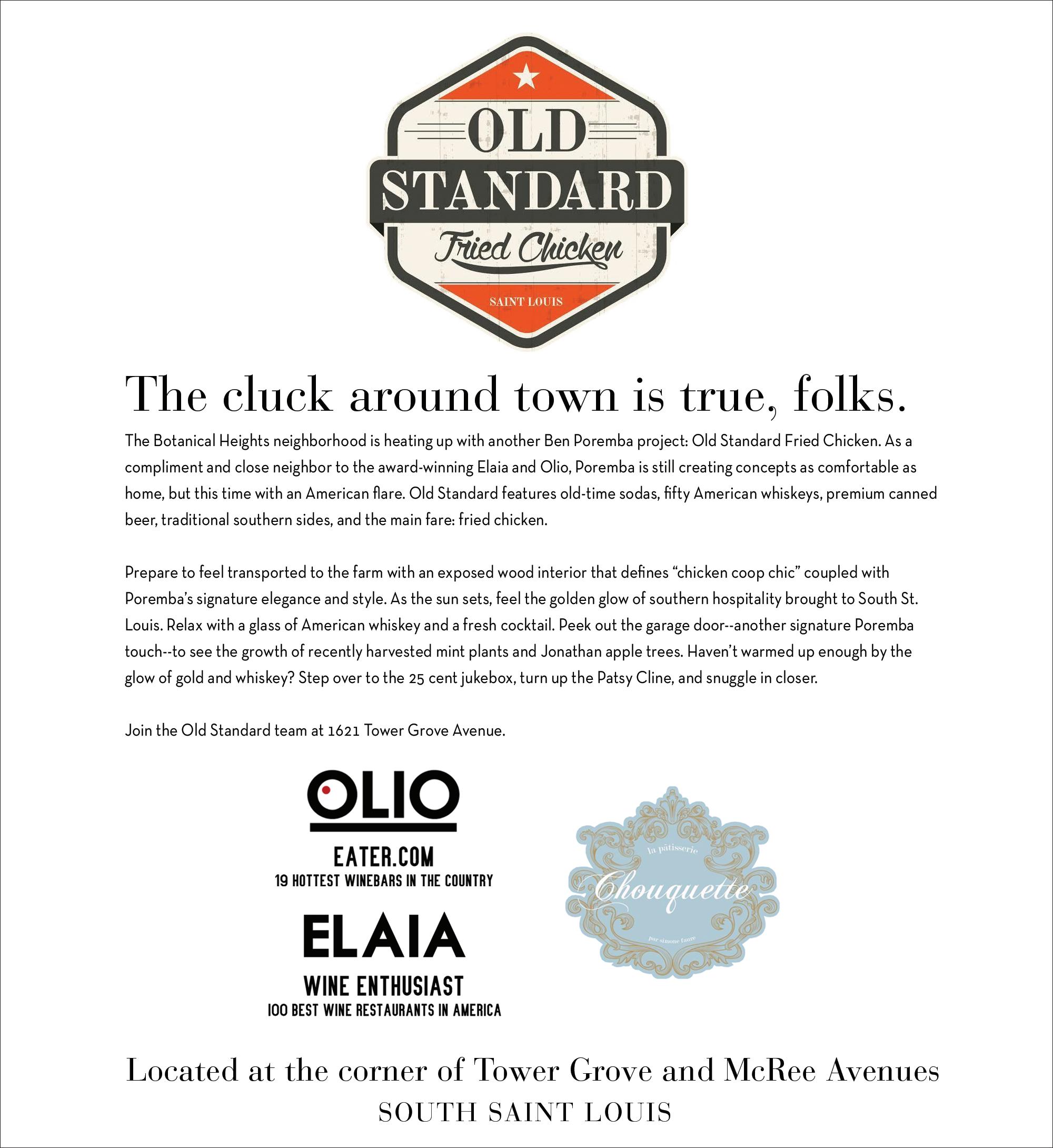 The intersection of Tower Grove and McRee avenues is beginning to look a lot like a scene out of Richard Scarry’s Busytown . Restaurateur Ben Poremba’s new Old Standard Fried Chicken joins his other bustling destinations in Botanical Heights: Olio, Elaia and La Patisserie Chouquette. Old Standard dishes up Southern cuisine daily. Fried chicken is king here, but sides, salads and snacks like Charlotte’s Mother’s Dressed Eggs and smoked whitefish croquettes are well worth exploring. Indulge in biscuits or cornbread and opt for one of the compound butters served in ramekins, each with a fancy paraffin cover bearing the restaurant’s logo. American whiskey, especially bourbon, is the spirit of this casual, 55-seat spot. But you won’t go wrong sipping soda pop; choose from more than a dozen bottled varieties and another handful of fresh, herbaceous house versions.