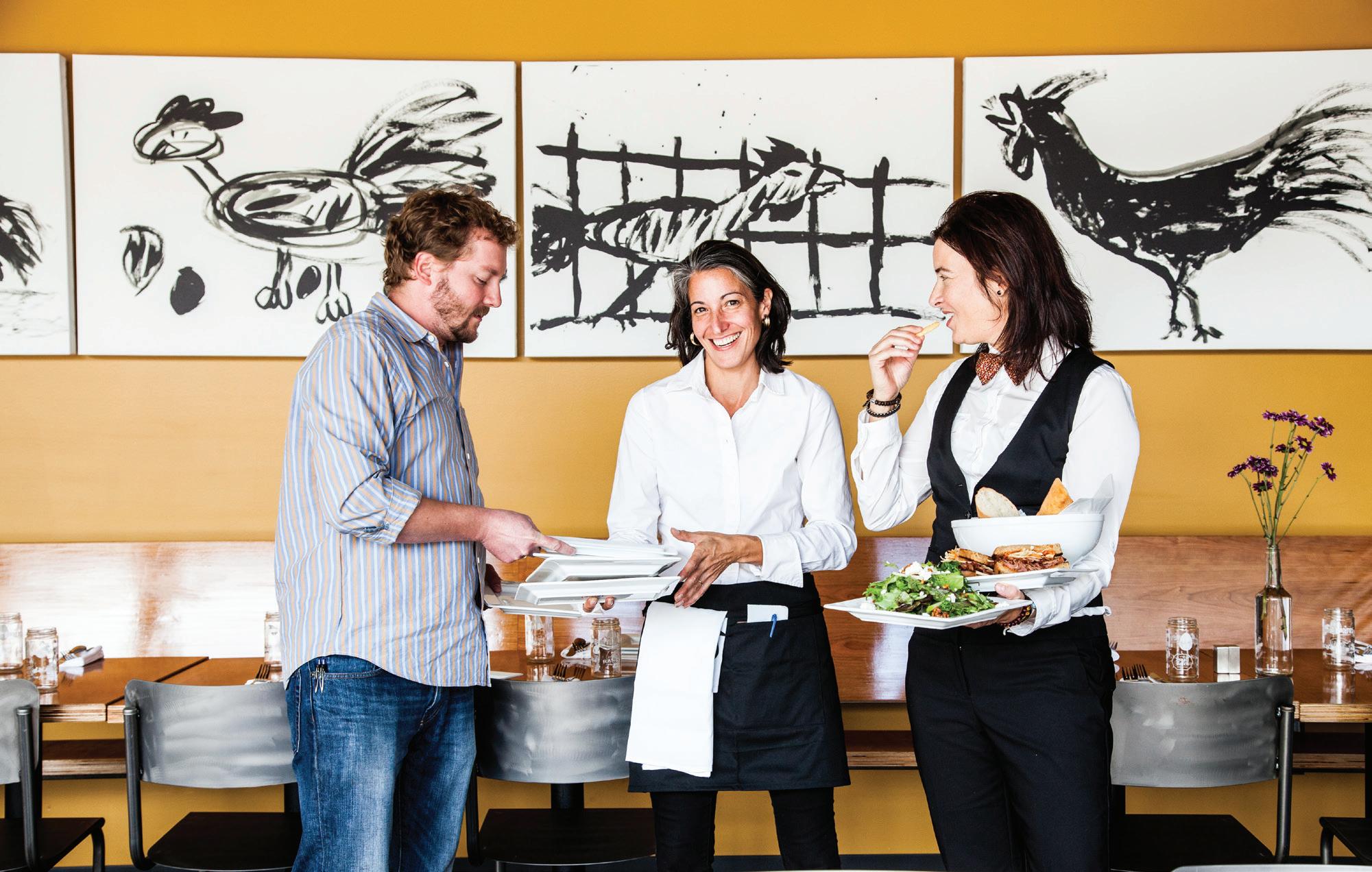 Restaurateur Dave Bailey gives Sauce executive editor Ligaya Figueras basic server training at his newly opened Rooster, while Sauce publisher Allyson Mace effortlessly balances a stack of loaded plates.