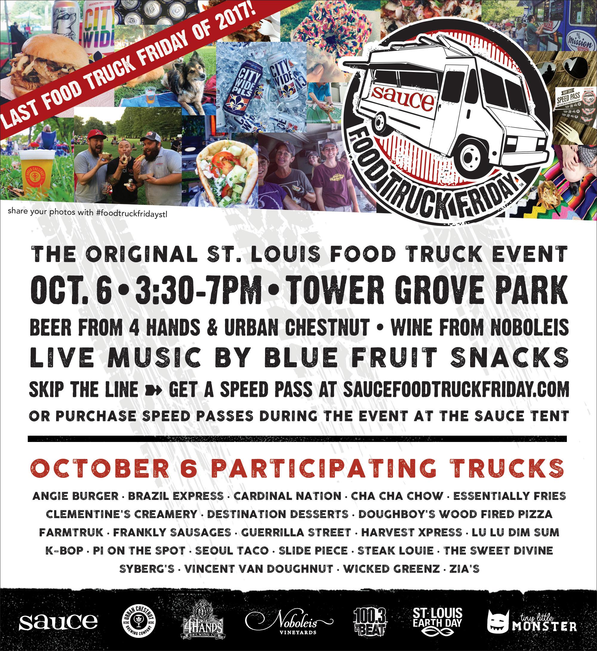 Oct. 6 – 3:30 to 7 p.m., Tower Grove Park, 4256 Magnolia Ave., St. Louis, 314.772.8004, saucefoodtruckfriday.com