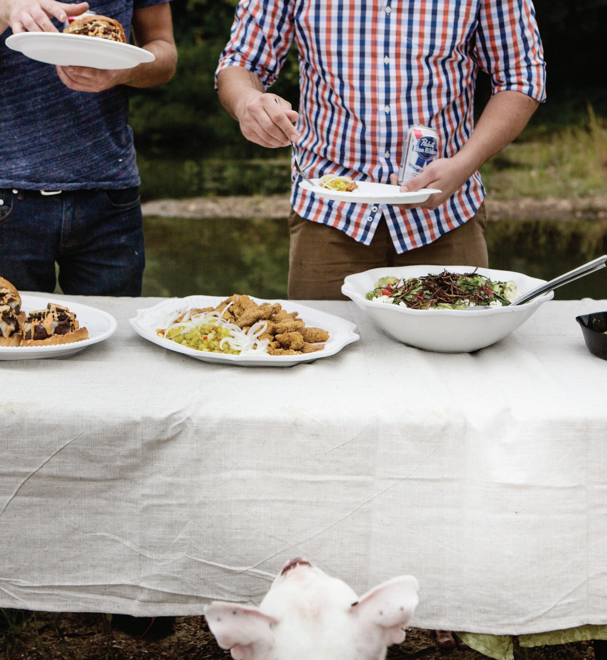 from left, smoked burgers, fried catfish nuggets and heirloom tomato salad
