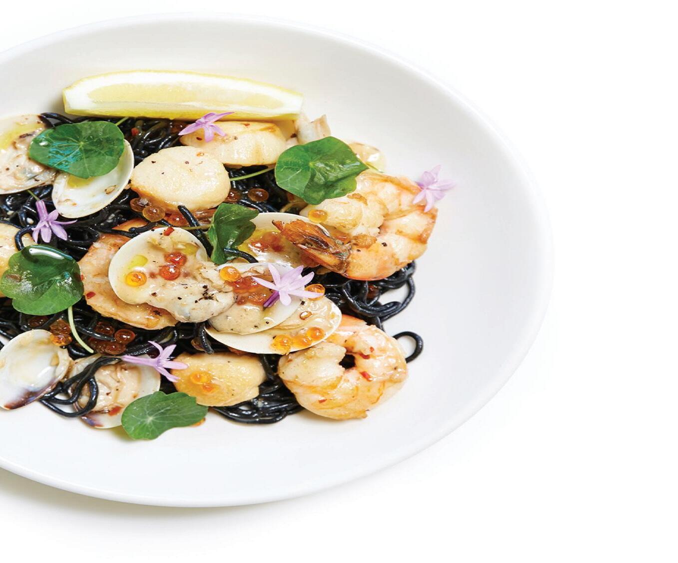 “The black spaghetti is for sure [the most popular menu item]. It’s a squid ink spaghetti made in-house with a simple chili-lemon-butter sauce, plus clams, scallops and prawns, and then we top it with salmon roe.”