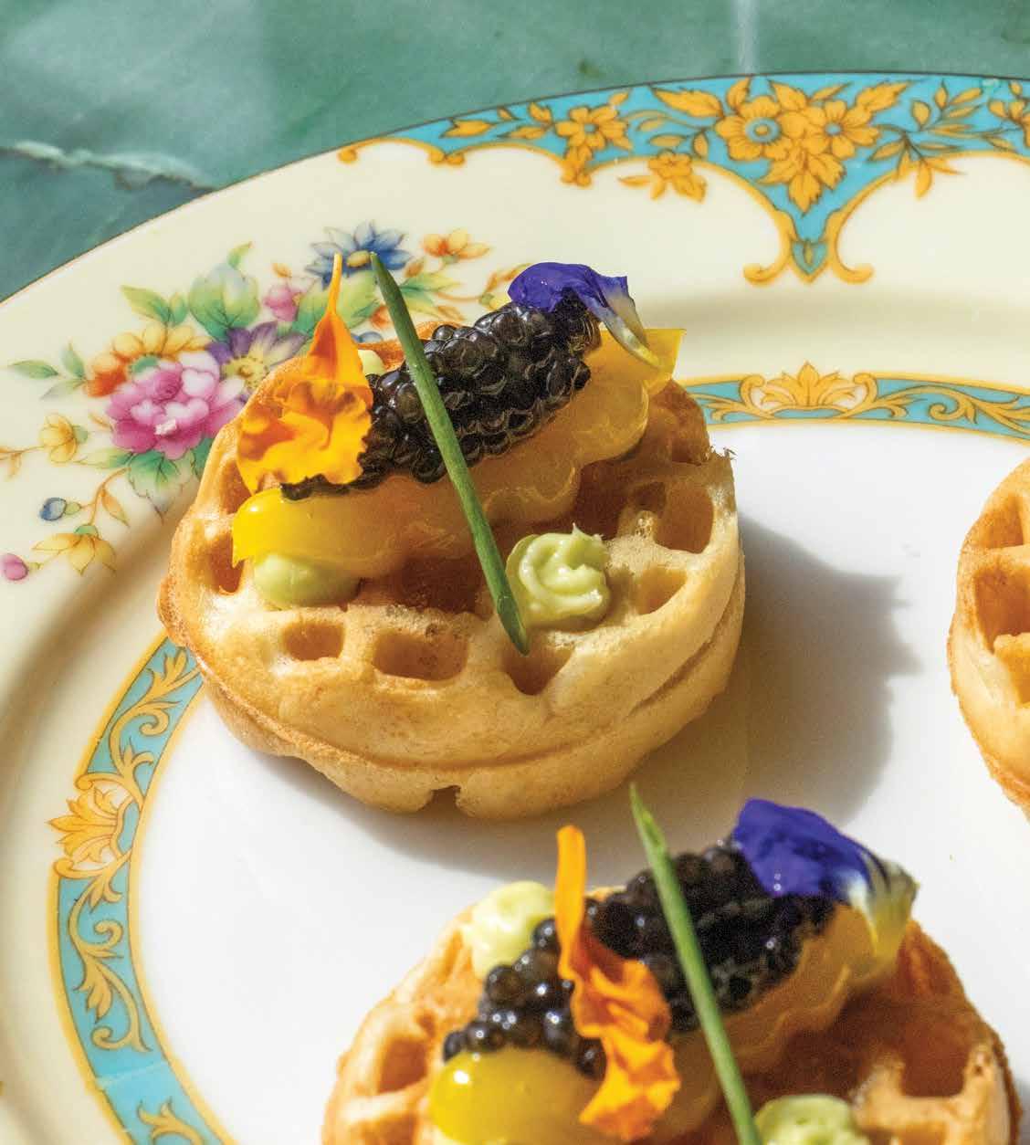 On a recent visit, the standout was the caviar, a playful yet sophisticated combination of textures and flavors. Mini sourdough waffles form the base, layered with chive-infused cultured butter, Champagne jelly, and a sous-vide egg yolk before being crowned with a delicate dollop caviar. “It’s truly a fun and unique way to enjoy caviar, with each element complementing the salty, briny flavor of the caviar,” said chef and coowner Wayne Sieve.