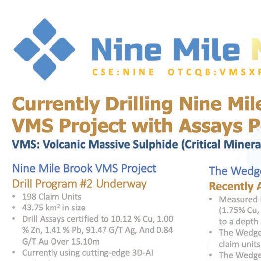 Nine Mile Metals Ltd. is a Canadian public mineral exploration company focused on Critical Minerals Exploration (CME) VMS (Cu, Pb, Zn, Ag and Au) exploration in the world-famous Bathurst Mining Camp, New Brunswick, Canada. The Company’s primary business objective is to explore its four VMS Projects: Nine Mile Brook VMS; California Lake VMS; Canoe Landing Lake (East–West) VMS and the new Wedge VMS Projects. The Company is focused on Critical Minerals Exploration (CME), positioning for the boom in EV and green technologies requiring Copper, Silver, Lead and Zinc with a hedge with Gold.