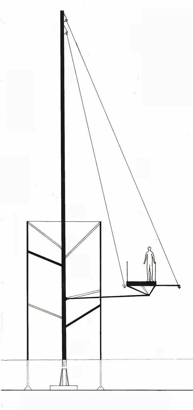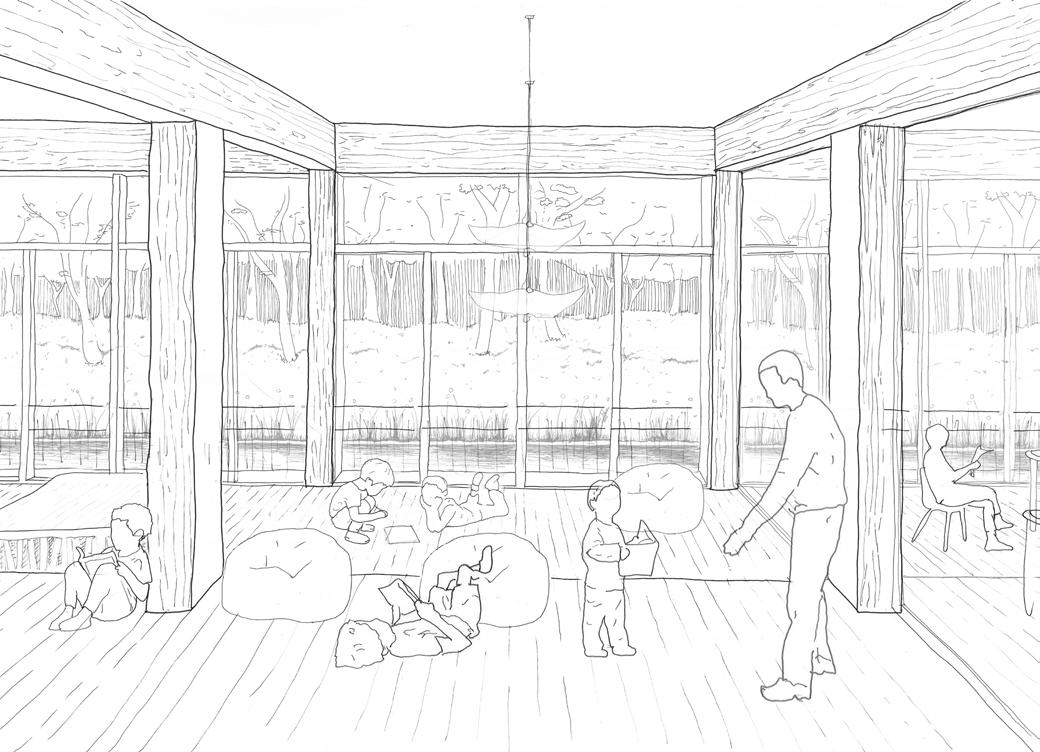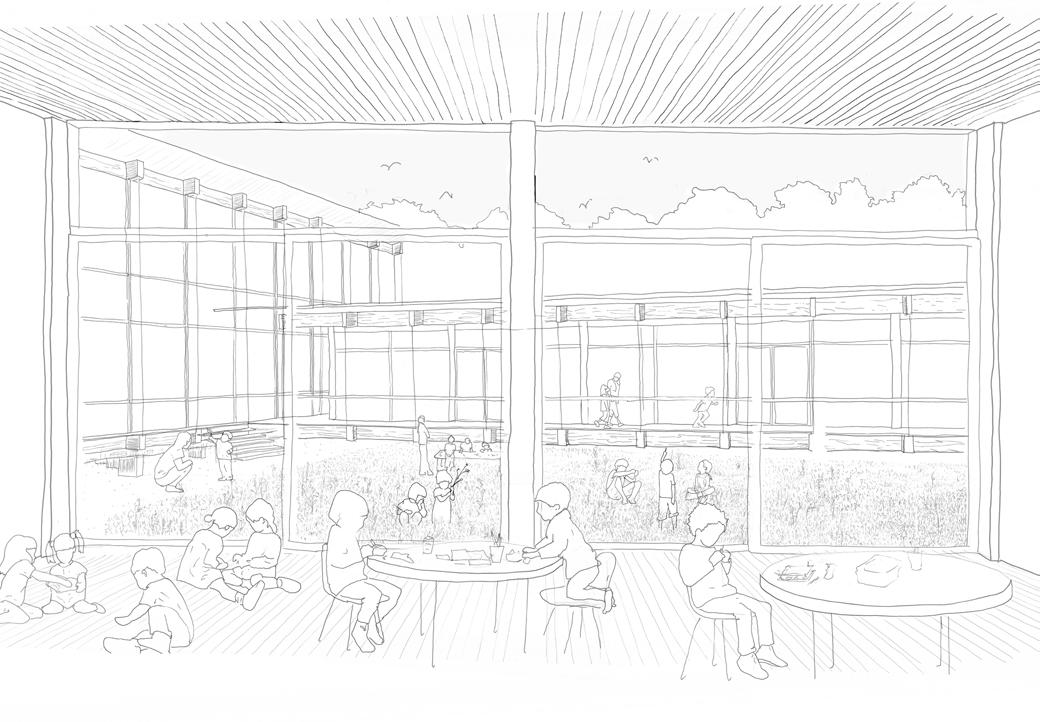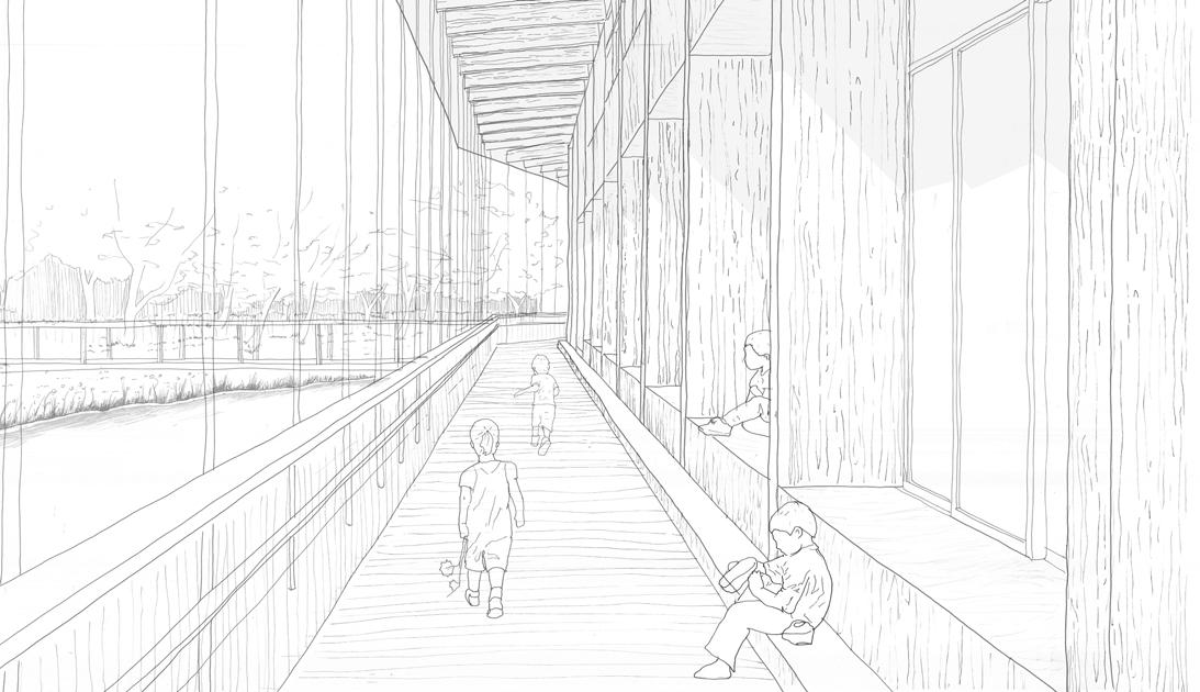 Pour prendre en compte de l’environnement, le volume du bâtiment s’implante le long du courant d’eau dans une attitude horizontale et la trame en poteaux porteuse permet d’accompagner l’usager dans sa promenade. Ainsi le bâtiment est surélevé et porté par les poutres principales sous la toiture permet de suspendre les passerelles par les tirants métalliques.