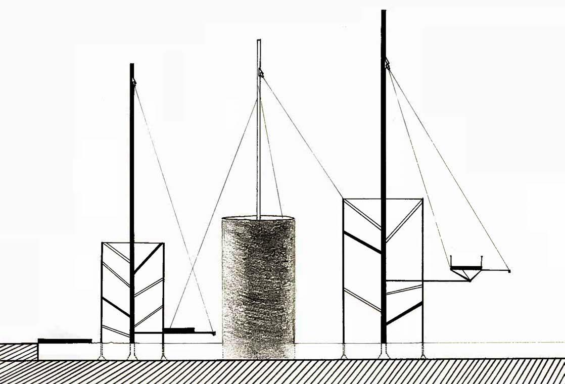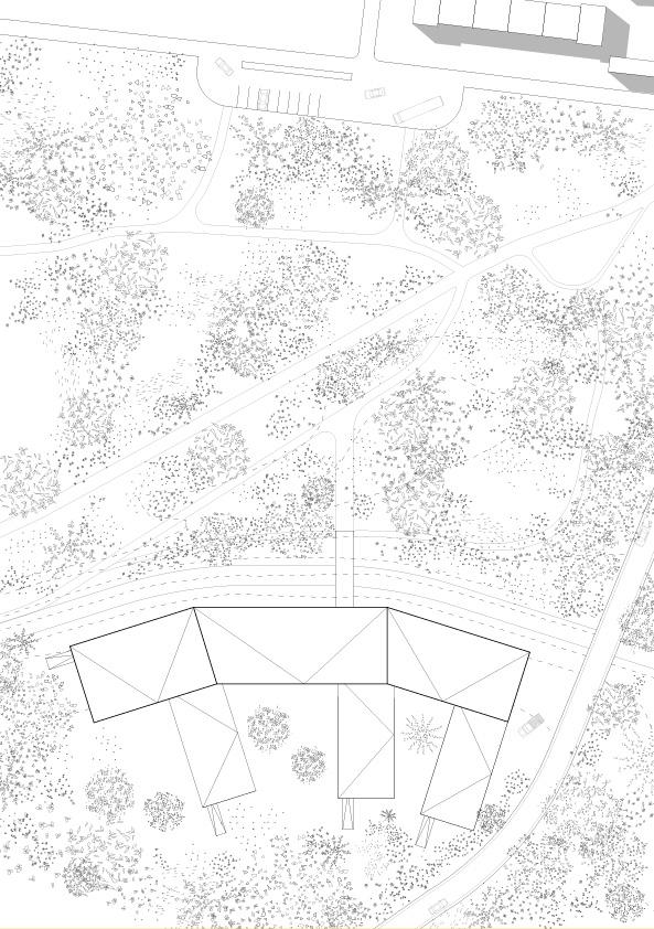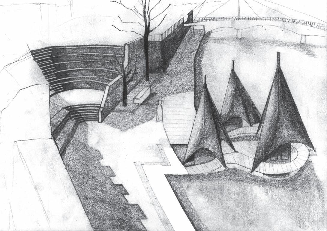 Mon projet s'inspire de l'architecture de Fried Otto qui propose une architecture en mouvement avec l'idée de toit suspendu. Il se constitue d'un sentier de promenade couvert par un tissu suspendu passant entre trois cylindres. Toute personne se promenant dans le pavillon peut admirer des peintures exposés sur les cylindres. Le spectateur suivant le chemin va alors prendre de la hauteur sur l'installation et expérimenter un nouveau regard sur celle-ci.