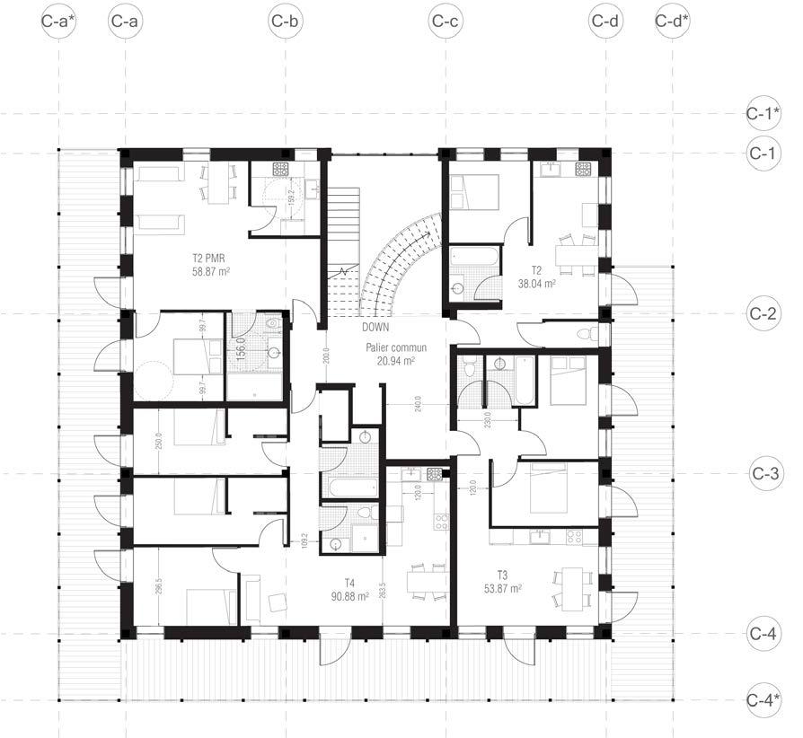 Une figure de plots permet d’abriter les bâtiments dans la nature et la vue agréable alentour. Quatres logements sont assemblés autour d’un palier collectif éclairés par la lumière du nord et sud. Sur ce niveau, les habitants peuvent rencontrer différents individus ou familles : un couple personne âgées, des étudiants colocataires chez les personnes âgées, célibataire ou une famille avec des enfants etc. Grâce aux logements adaptés pour les typologies divers, cela permet alors de mixer les générations et de qualifier les rencontres dans le bâtiment.
