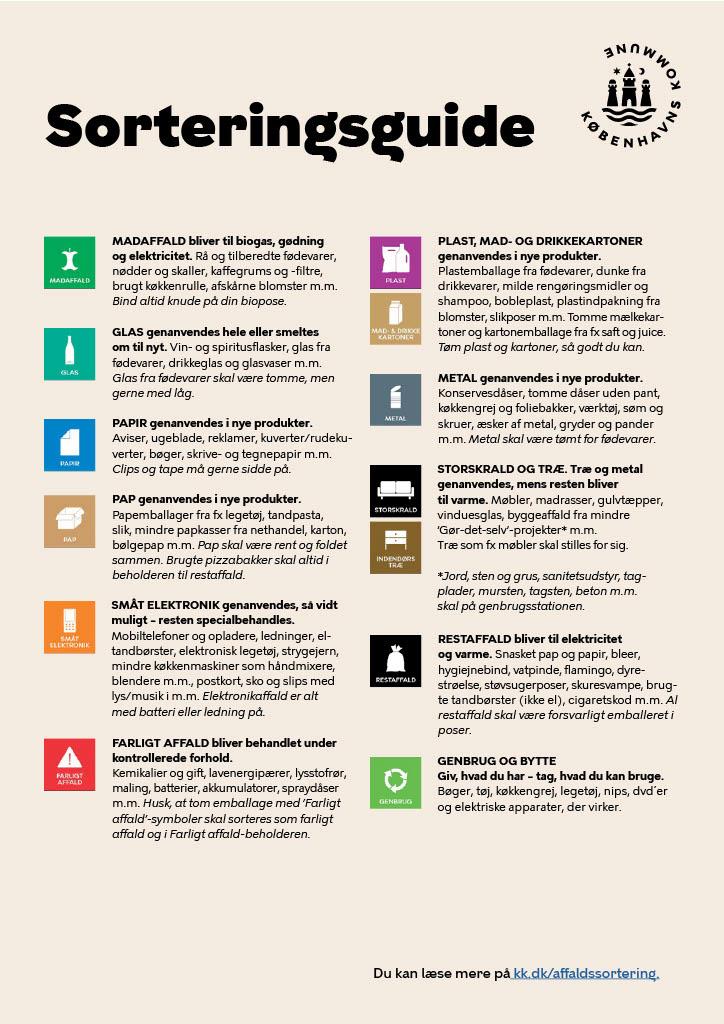 Vi følger Københavns Kommunes retningslinjer for optimal affaldssortering. Se et overblik over, hvordan vi sorterer vores affald her: