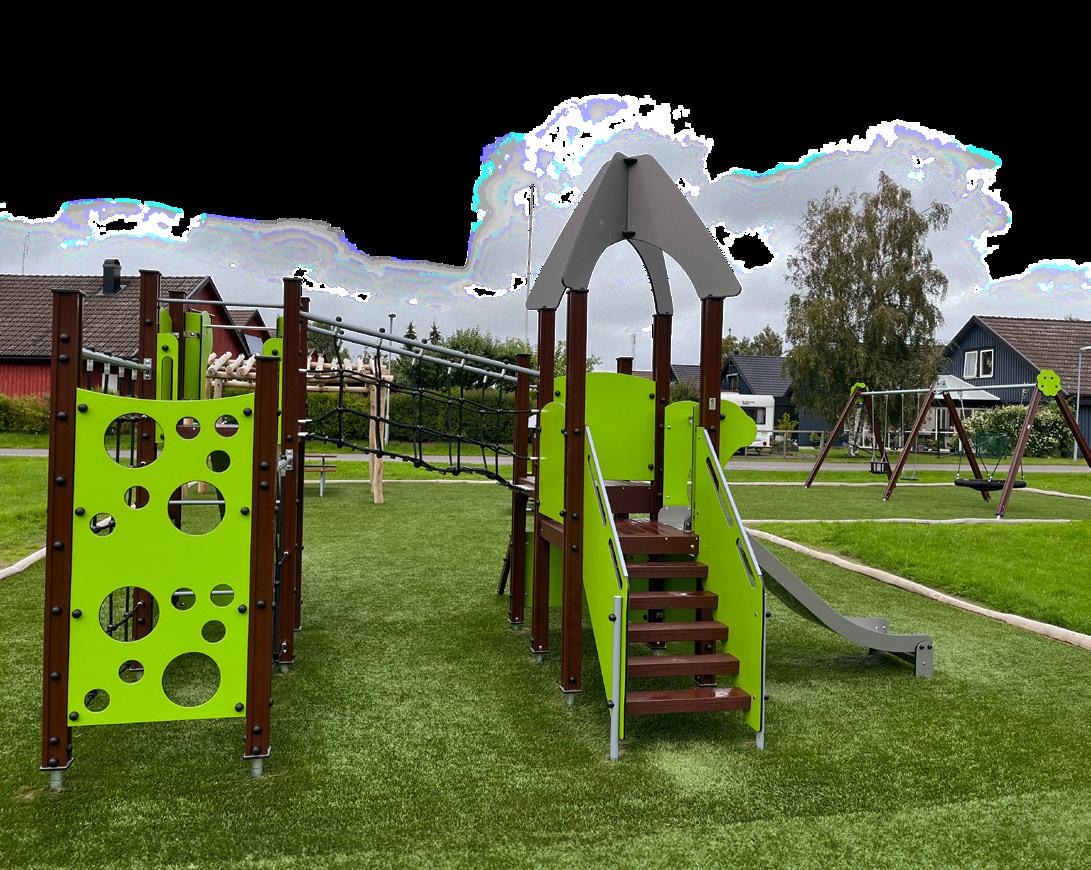 Konstgräs som underlag bidrar även till att lekparken kräver mindre skötsel och underhåll.