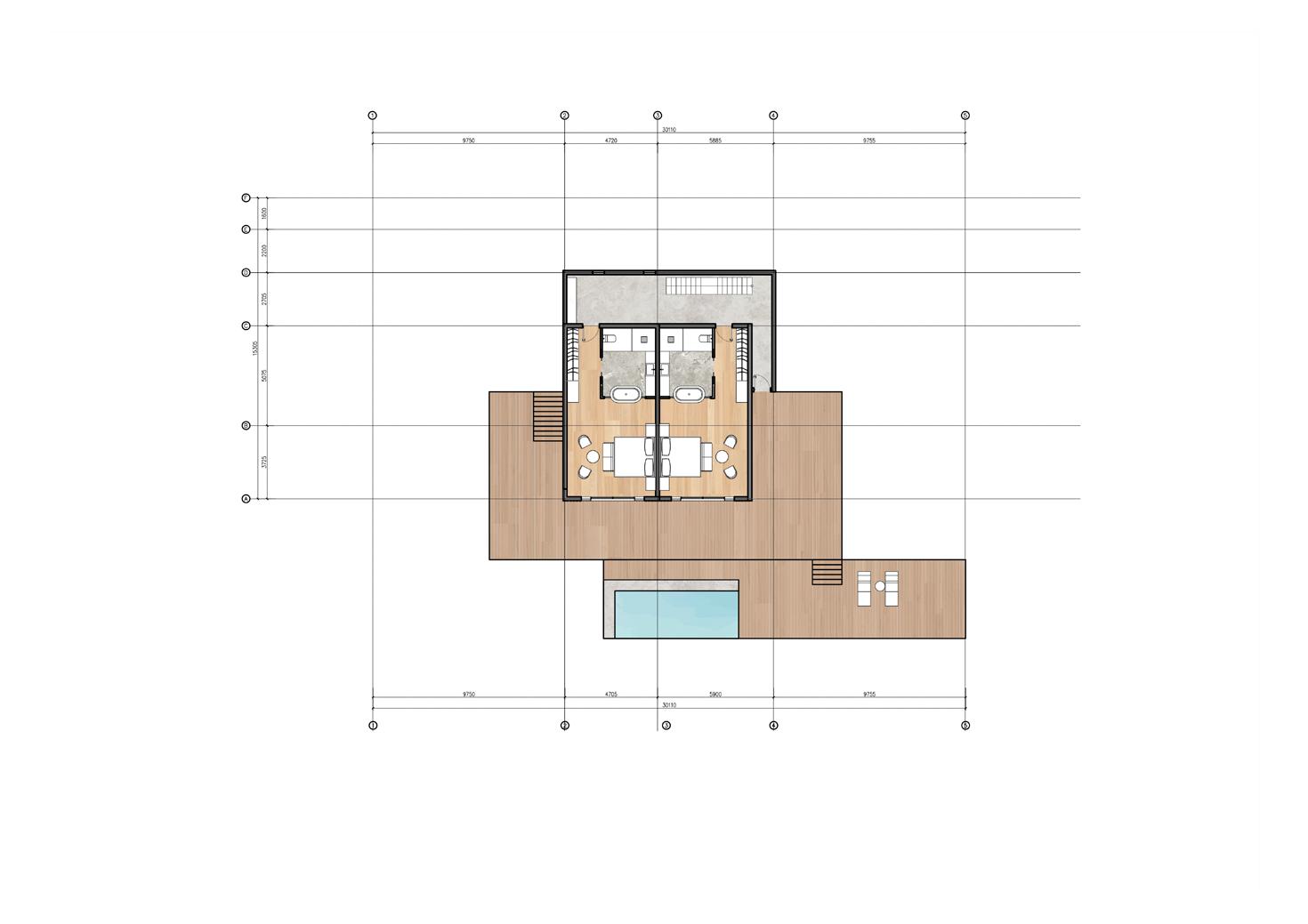 The resort contains three different types of units for guests to choose from. Unit 1 includes two independent guest rooms and a suite, as well as a common dining area. The two sides of unit type 2 are independent loft units, a public bar and can be located in the middle of the building. Type 3 consists of 4 separate bedroom units and a shared living room. Each unit includes an open outdoor terrace. The platform contains a small swimming pool as well as viewing and resting areas.