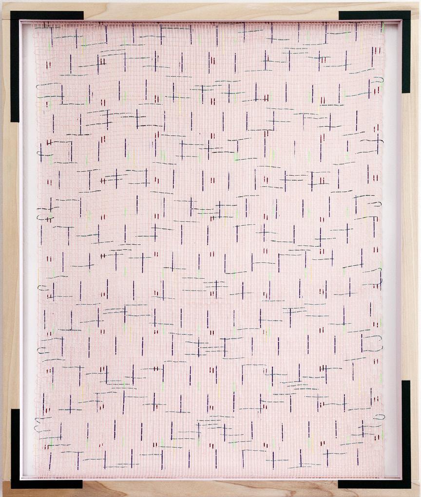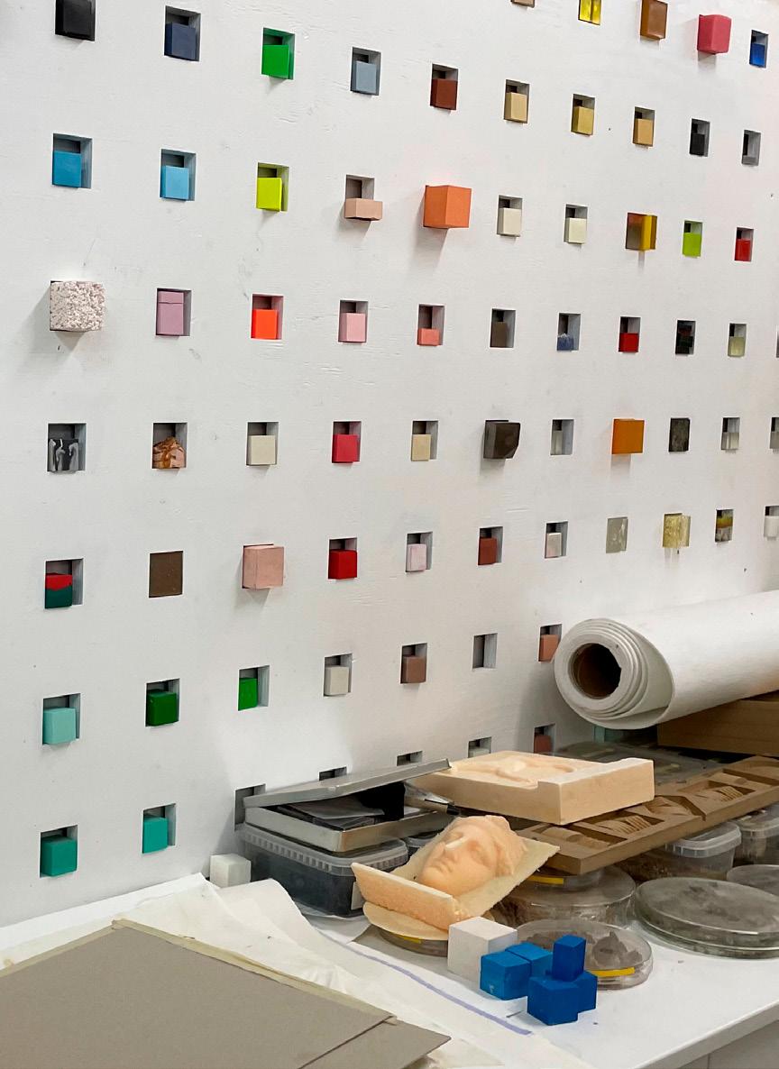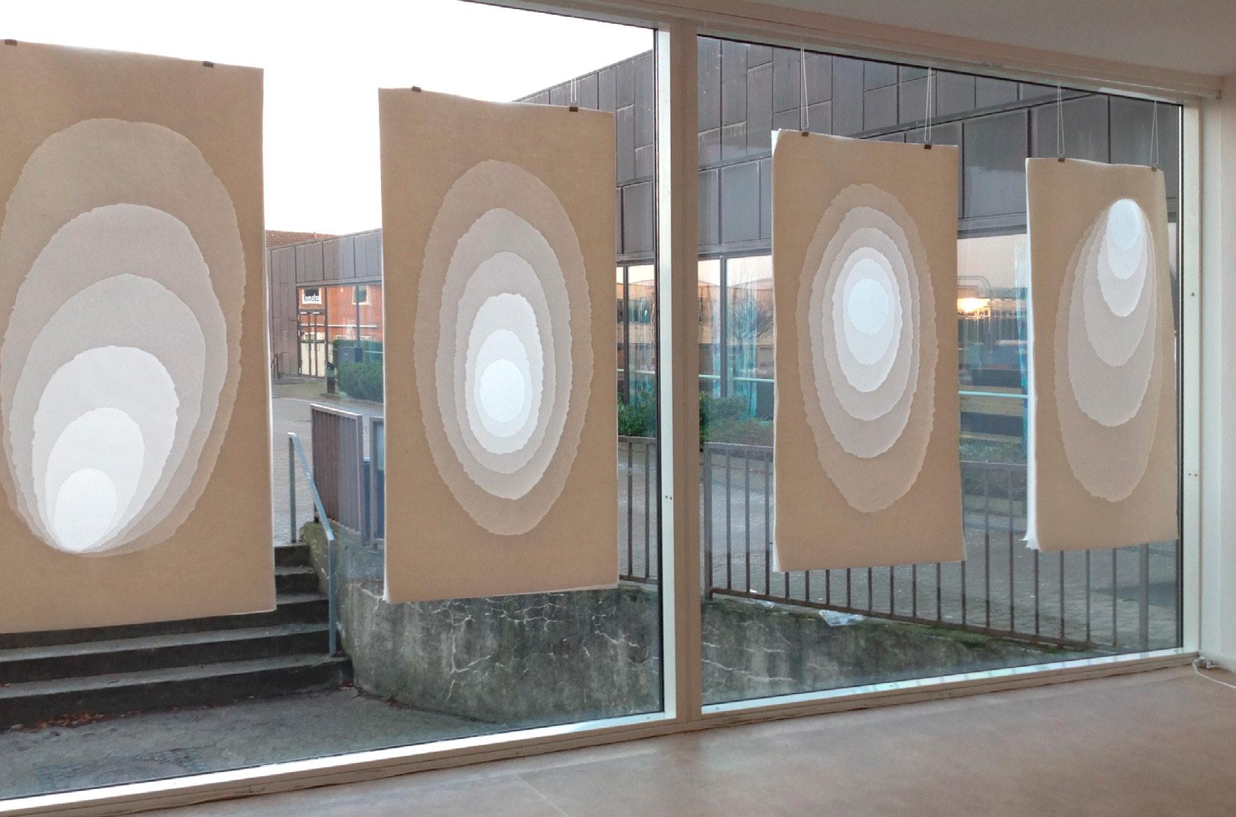 Gennem havedøren kan jeg se ud på en stor græsplæne, der ender ved en smuk bøgehæk. Hækken skjuler kirkegården. Kun et lille hvidkalket kapel samt toppen af de stedsegrønne træer og buske stikker toppen op over hækken. Jeg arbejder ofte med et projekt ad gangen. Det kan være tekstile skulpturer, jeg syr på til en bestemt udstilling, eller maleri, akvarel eller grafik og monotypi som jeg laver på min grafikpresse. Jeg har flere staffelier, der nemt kan flyttes rundt efter behov, og de kommer i brug, når jeg har spændt lærreder op eller når jeg arbejder på masonitplader.